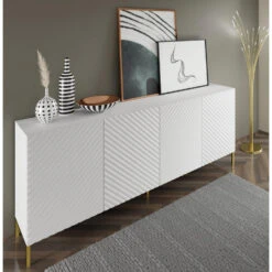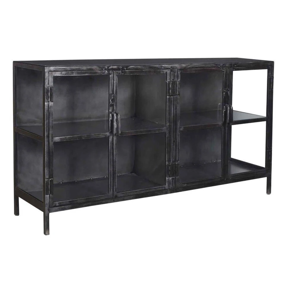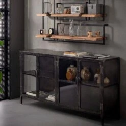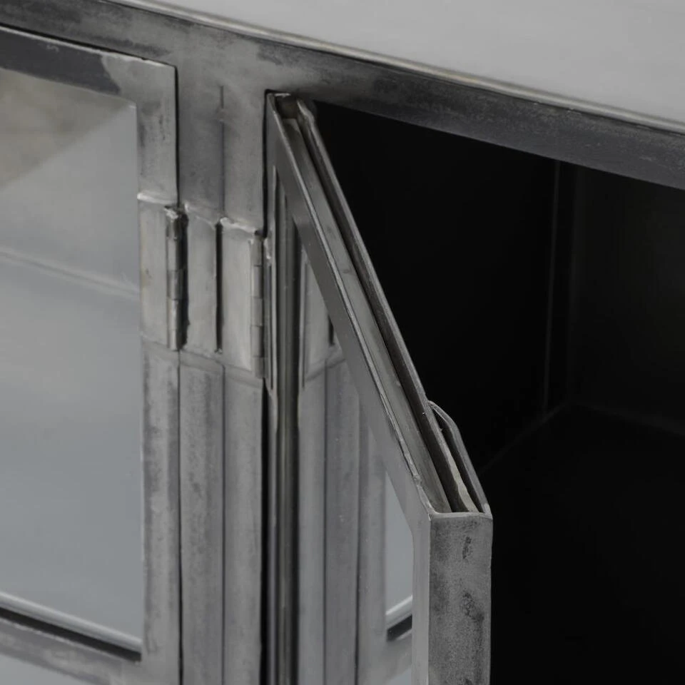 Dit dressoir heeft veel weg van onze Rift-serie. Echter door het veelvuldig gebruik van gun metal, wordt dit exemplaar Rift Metal genoemd. Het dressoir is voorzien van 4 glazen deuren en 1 schap. In het midden is het dressoir gesloten, dus hij bestaat uit 2 compartimenten. Dressoir Rift metal wordt opgebouwd geleverd.