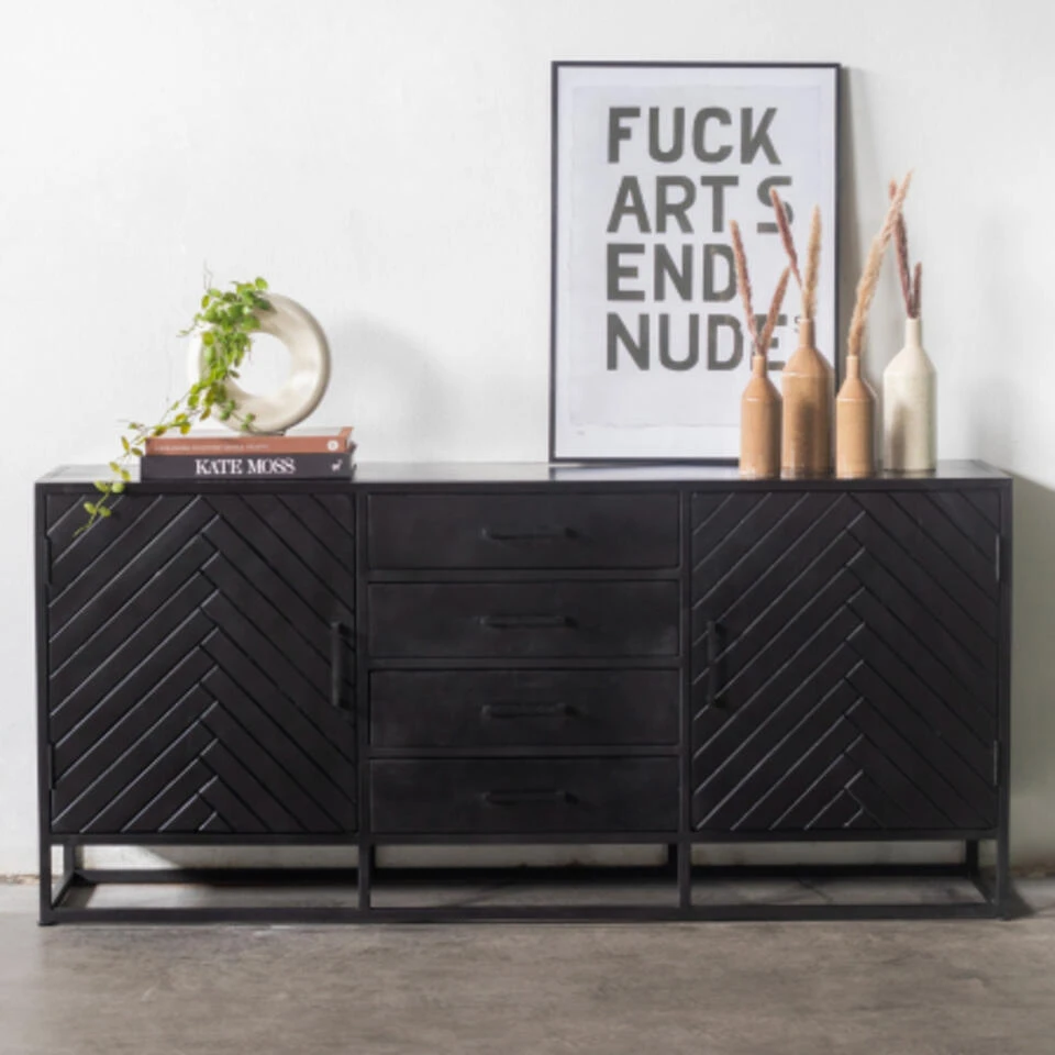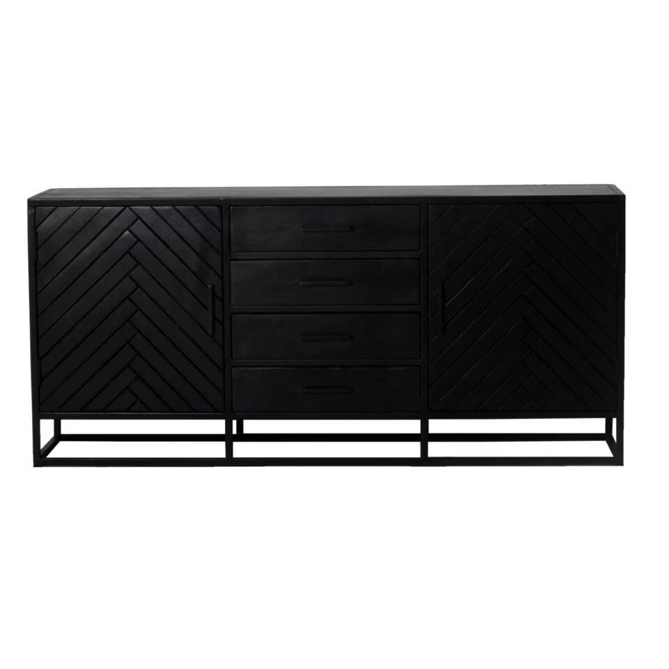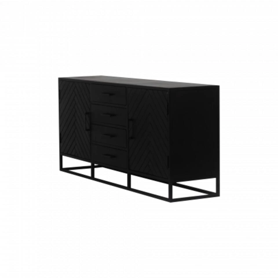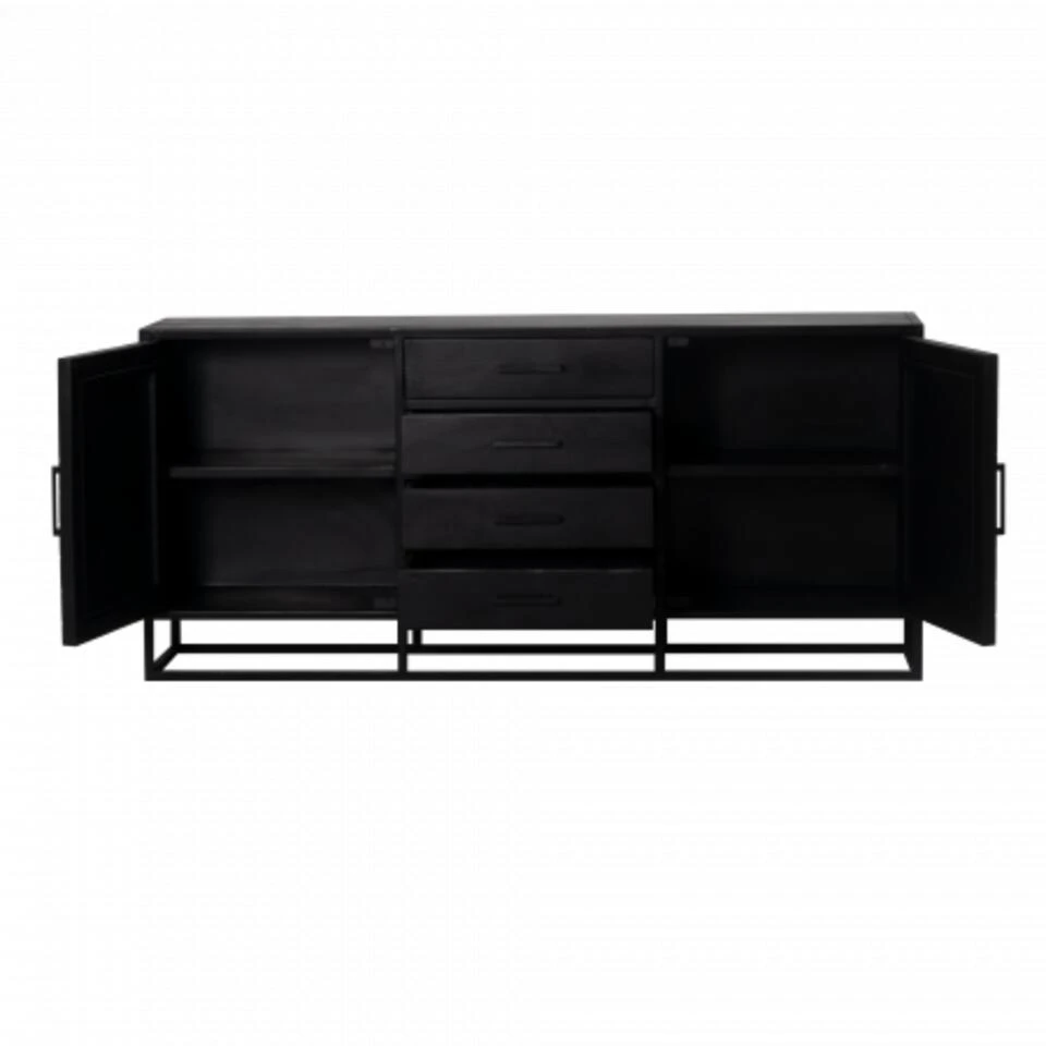 Dit dressoir heeft 2 deuren en 4 lades waar je je al je spullen in kwijt kan. Het dressoir is gemaakt van zwart-afgewerkt mangohout met een zwart metalen frame en bovenblad. Dit dressoir is 165cm breed, 40cm diep en 75cm hoog.