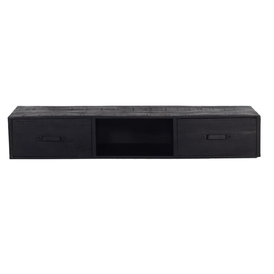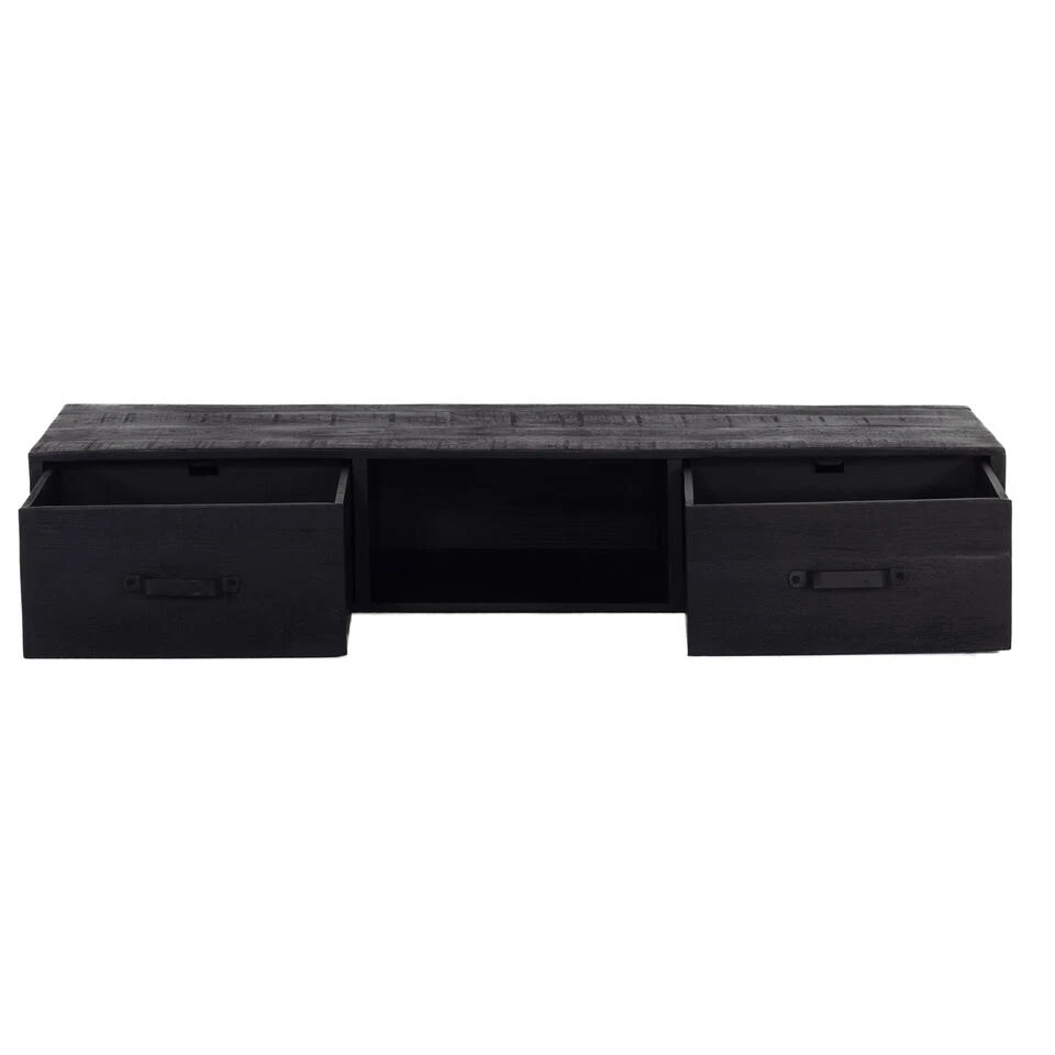 Dit zwevend tv-meubel is gemaakt van mangohout in combinatie met ijzer en is in het zwart afgewerkt. Dit zwevend tv-meubel heeft 2 lades. Dit geeft de mogelijkheid om al je apparatuur in de kast te bewaren en netjes weg te werken. Met zijn stoere uiterlijk past hij binnen een industrieel interieur. Dit tv-meubel is 120cm breed, 40cm diep en 20cm hoog. Het tv-meubel wordt inclusief montagemateriaal geleverd.