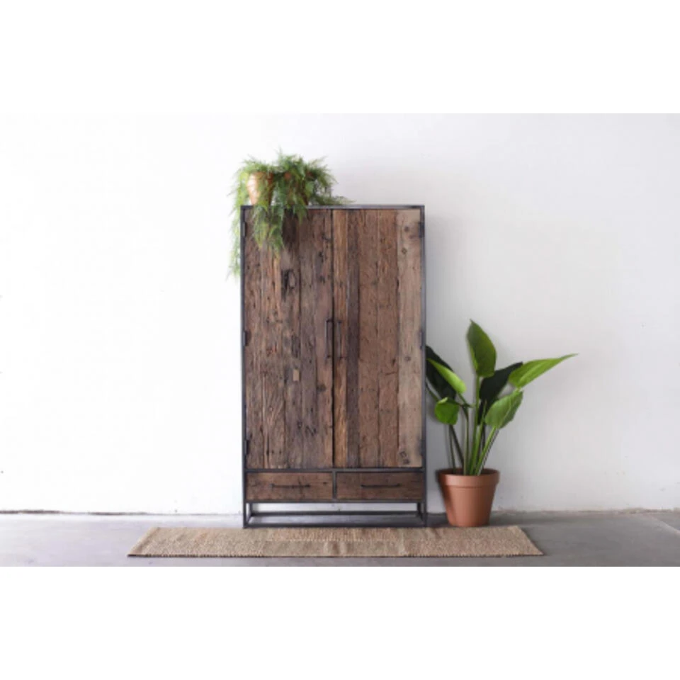 Genoeg opbergruimte in deze kast, de kast heeft dichte kastdeuren, hierdoor kan je ook spullen kwijt die je liever niet in het zicht hebt staan. Onderin heeft de kast 2 lades waar je wat kleinere spullen in kwijt kan. De kast is gemaakt van hout afgewerkt met zwart metaal die de kast een stoere en industriële look geven. Onze kasten bestaan uit een stuk en zijn dus geen bouwpakketten.