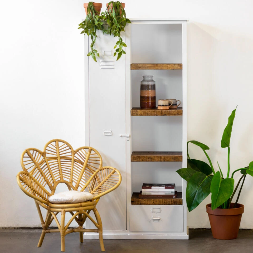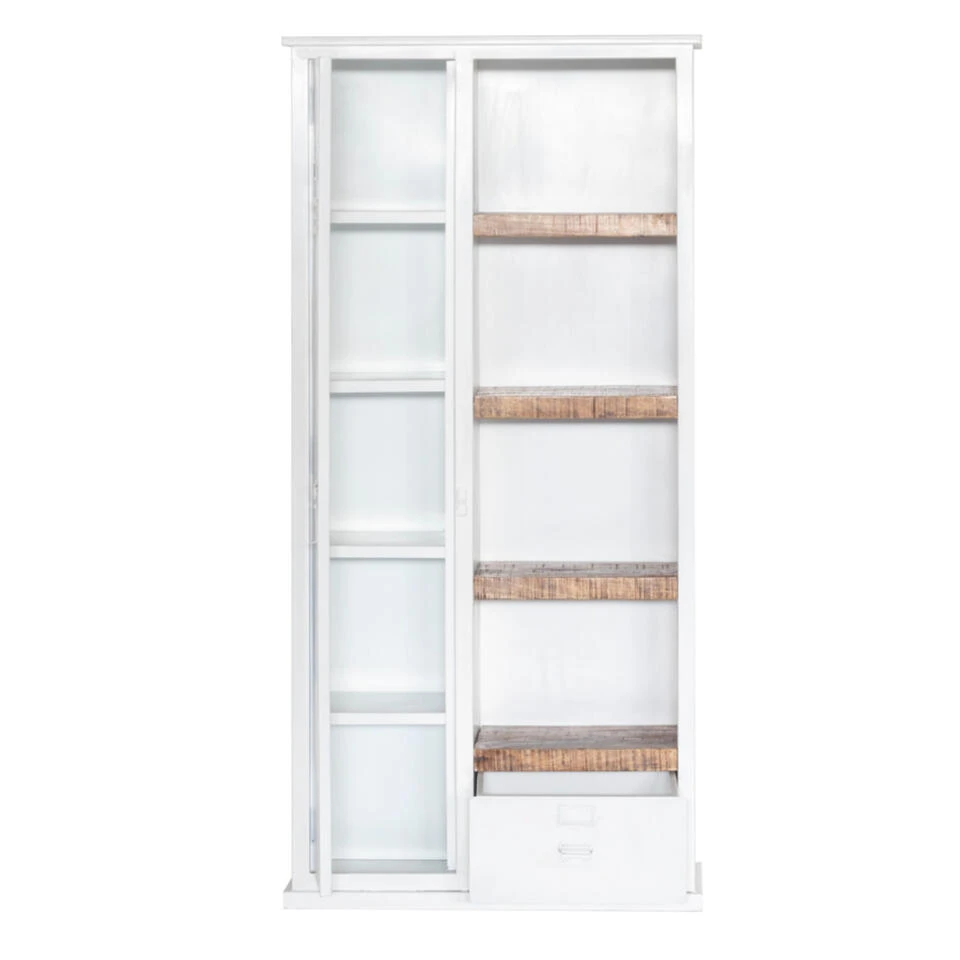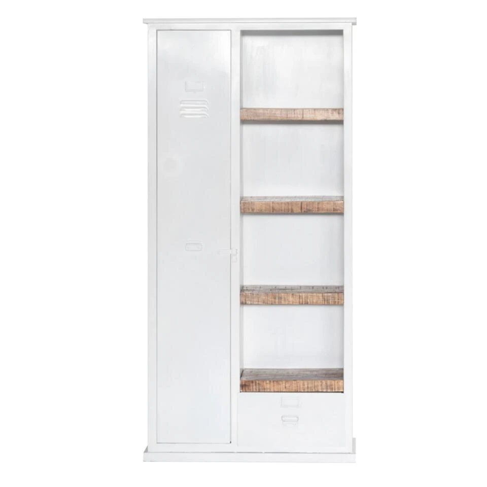 Met deze kast laat je jouw mooiste boeken of accessoires perfect tot hun recht komen. Gelukkig is er ook genoeg opbergruimte voor kleding of alle overige woon- en eetkameritems die je liever niet in het zicht hebt staan. De kast is 95 cm breed, 42 cm diep en gemaakt van metaal met in het midden houten planken.