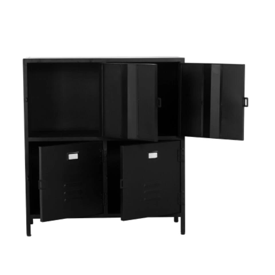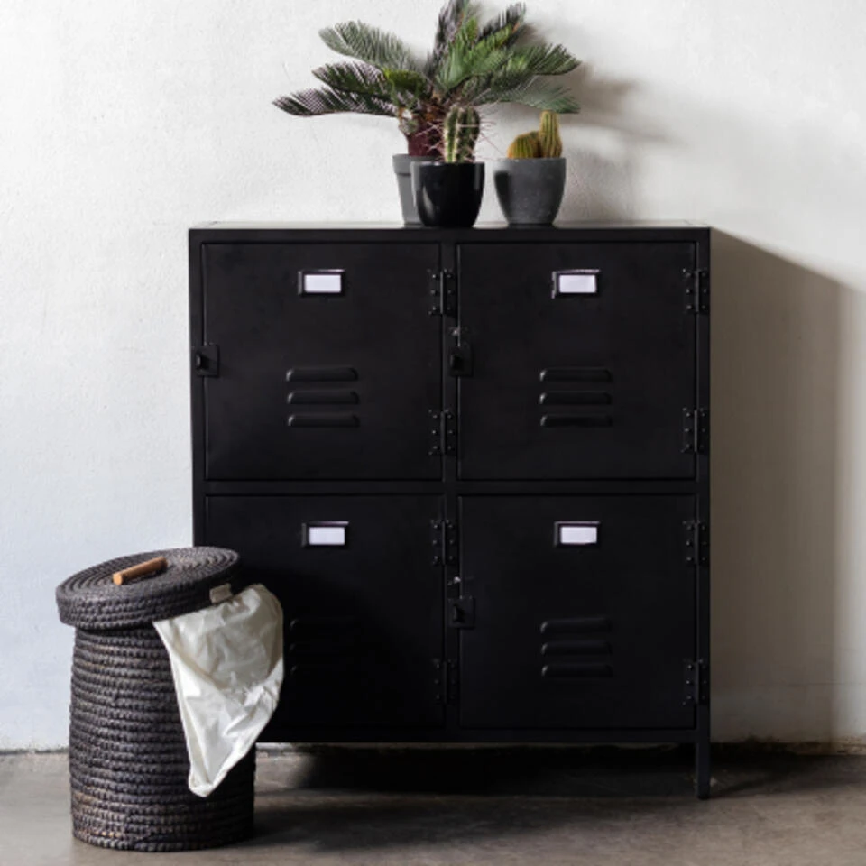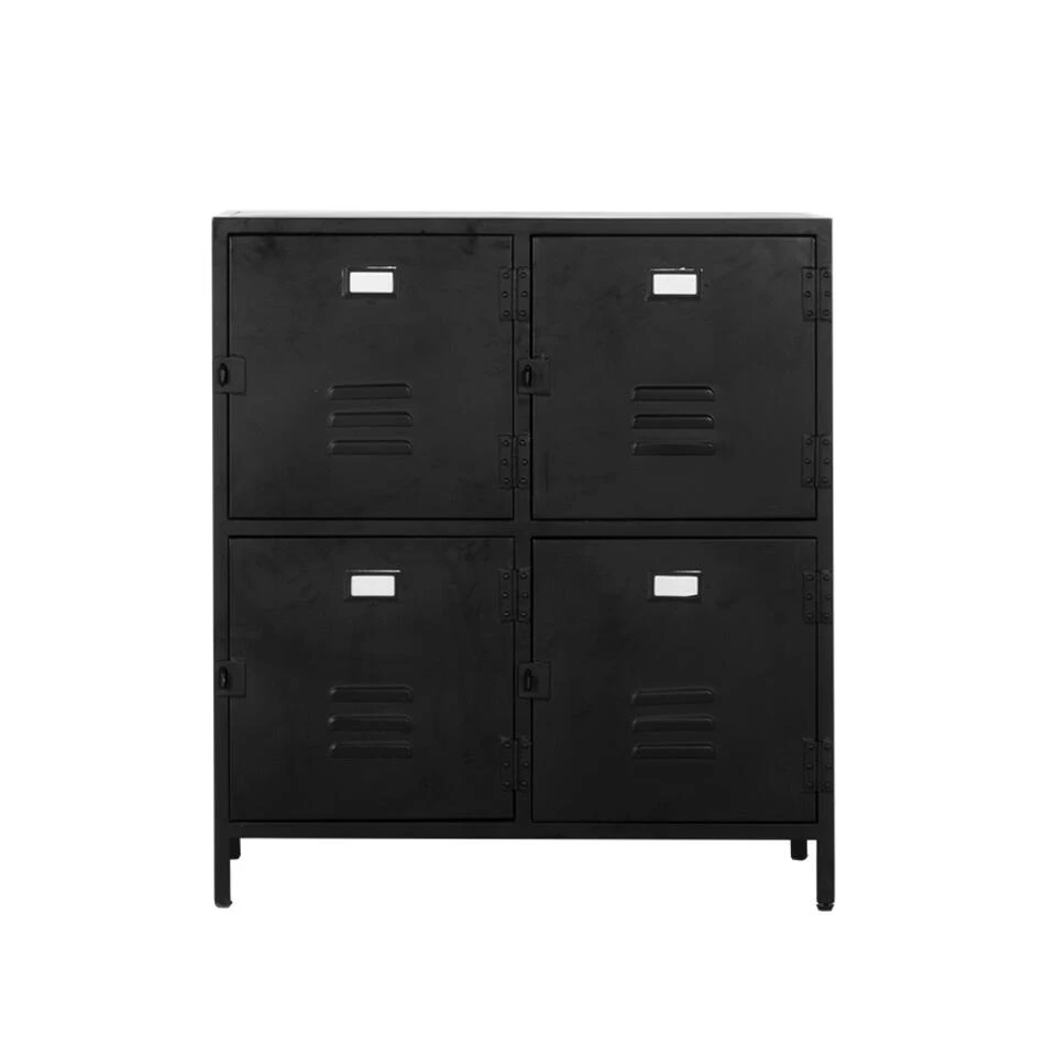Deze super-stoere locker met 4 deuren is een aanvulling voor echt élk interieur. De locker kan bijvoorbeeld gebruikt worden als schoenkast voor in de gang, als opbergkast in de kinderkamer of slaapkamer. Je kunt hem natuurlijk ook gewoon in de woonkamer zetten. Deze kast is er zowel in de groene als zwarte variant. Welke past het best bij jou? De kast is 95cm breed, 40cm diep en 105cm hoog. De kast is gemaakt van zwart metaal en is afgewerkt met een powdercoating. De vakken zijn aan de binnenkant 46cm breed, 40cm diep en 46cm hoog.