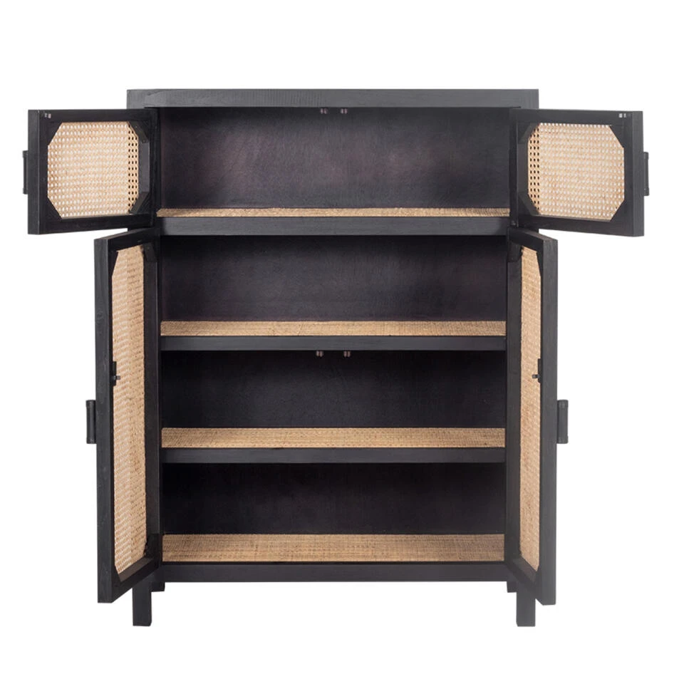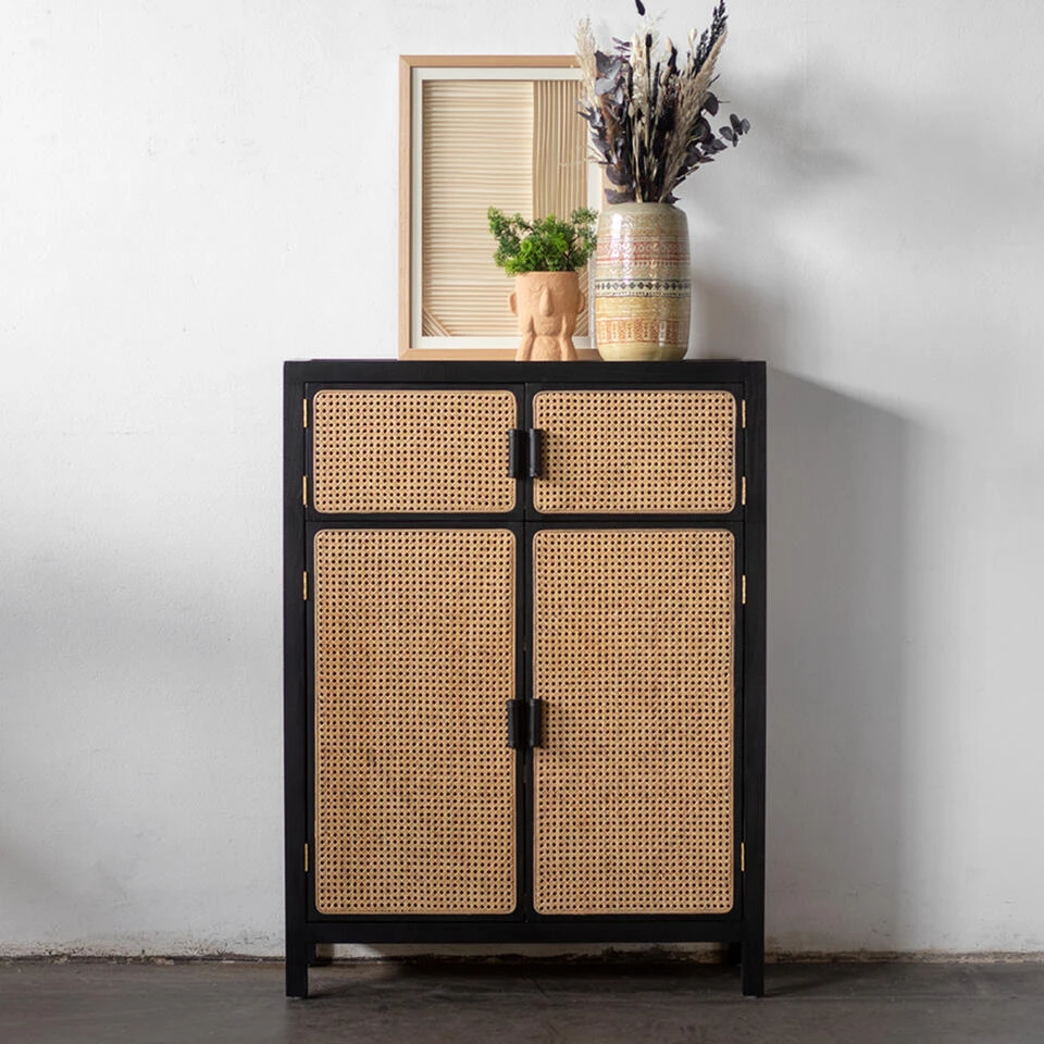 Opbergkast Novi Naturel/Zwart Deze prachtige kast gemaakt van zowel rotan als teakhout heeft een retro design. De kast heeft niet alleen een cool ontwerp, maar is ook ongelooflijk handig met veel opbergruimte. Deze kast is 120cm hoog. 90cm breed en 40cm diep.