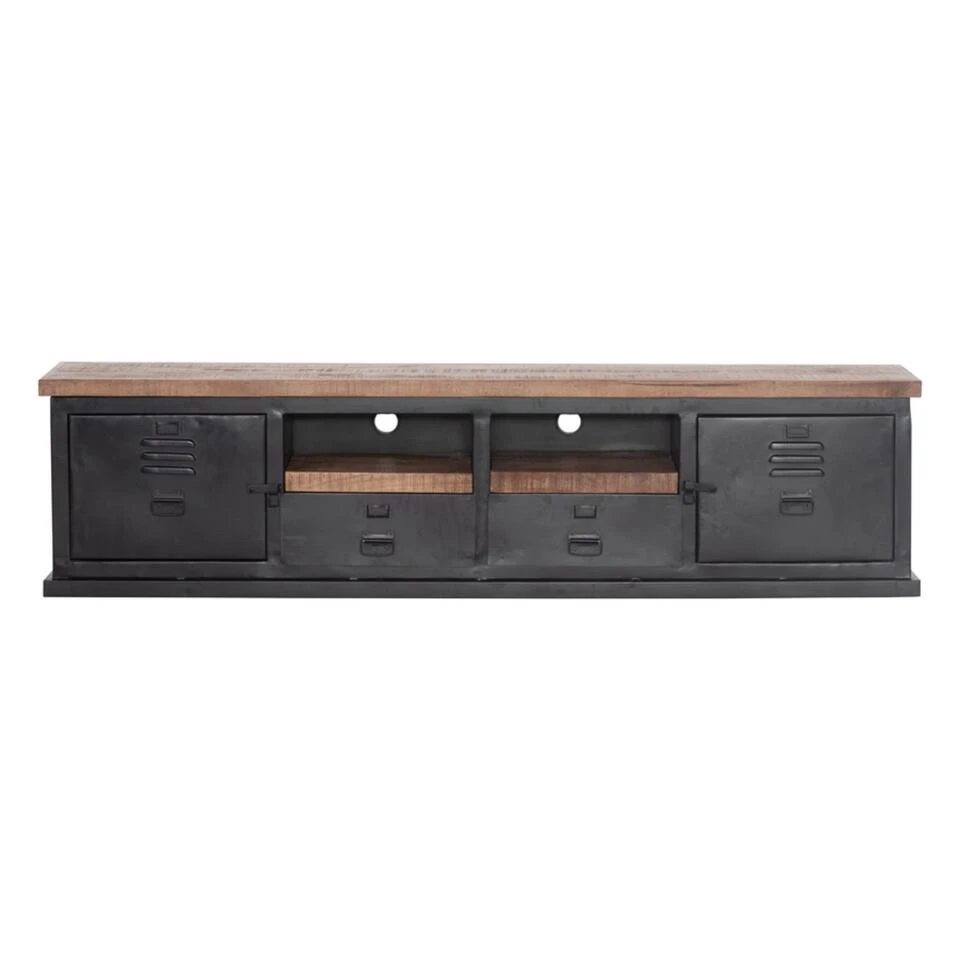 Tv-meubel Jake 200cm beschikt over 2 kastjes, 2 lades en een open vak. Het blad aan de bovenkant en van het open vak is van mangohout. Dit gecombineerd met het zwart metalen frame geeft je interieur een stoere, robuuste uitstraling.Tv-meubel Jake is 200 cm breed en beschikt over een gat aan de achterkant om alle kabels netjes weg te werken. Perfect dus ter ondersteuning van jouw televisie.