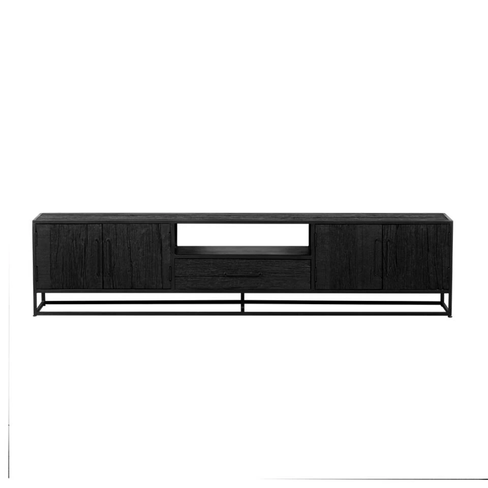 Dit tv-meubel is gemaakt van mangohout in combinatie met metaal en is in het zwart afgewerkt. Dit tv-meubel heeft 4 deurtjes en 1 lade. Dit geeft de mogelijkheid om al je apparatuur in de kast te bewaren en netjes weg te werken. Met zijn stoere uiterlijk past hij binnen een industrieel interieur. Dit tv-meubel is 200cm breed, 40cm diep en 55cm hoog.