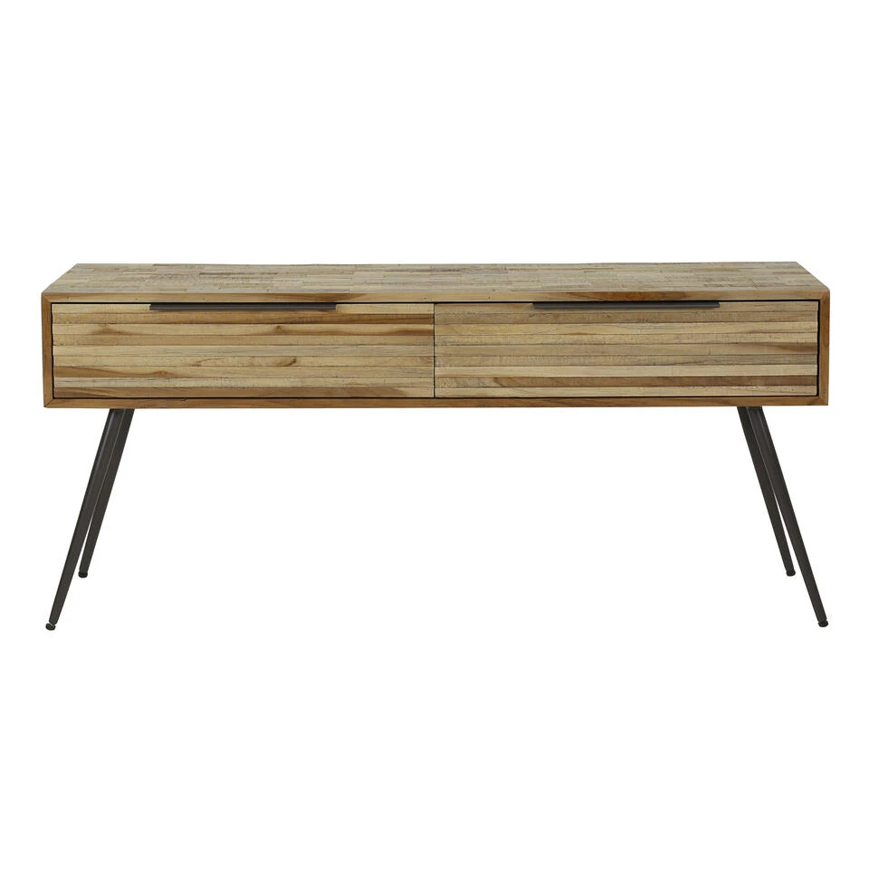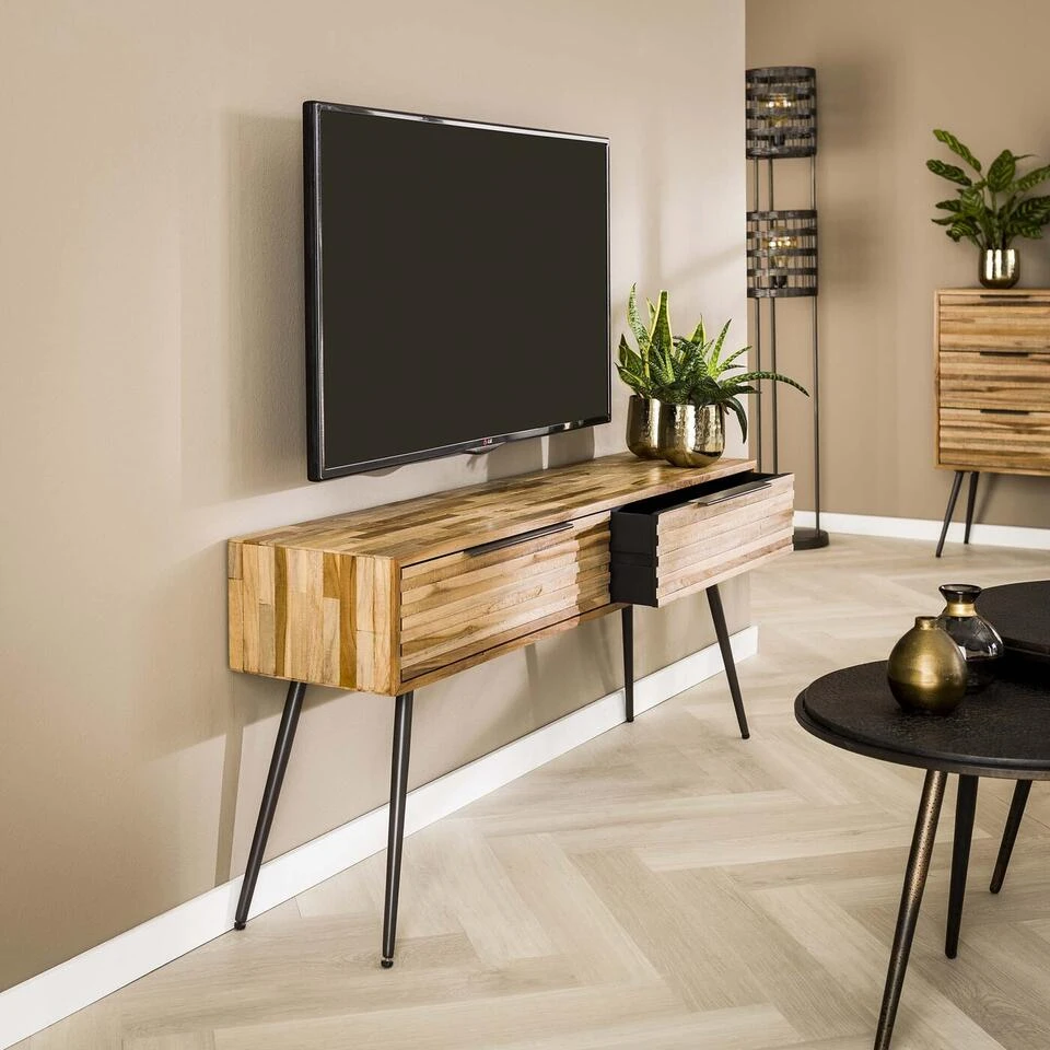 Dit TV-meubel ‘strip’ is uitgevoerd in verweerd teakhout, gelegd in strookjes met aan de voorzijde opgelegde strips van hetzelfde hout. Dit geeft een heel eigentijds en speels effect aan het TV-meubel. De tapse pootjes zijn uitgevoerd in metaal. Het TV-meubel heeft 2 lades die van binnen zijn afgewerkt met glad hout in een donker grijze kleur. Dit TV-meubel maakt onderdeel uit van de ‘strip’ serie. Is dit dé Tv-Meubel voor jou? Bestel de Giga Meubel Tv-Meubel dan nu direct online bij ! Het item wordt vanaf 100,- gratis bij jou thuisbezorgd.