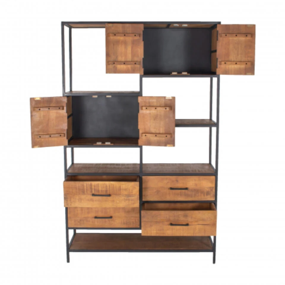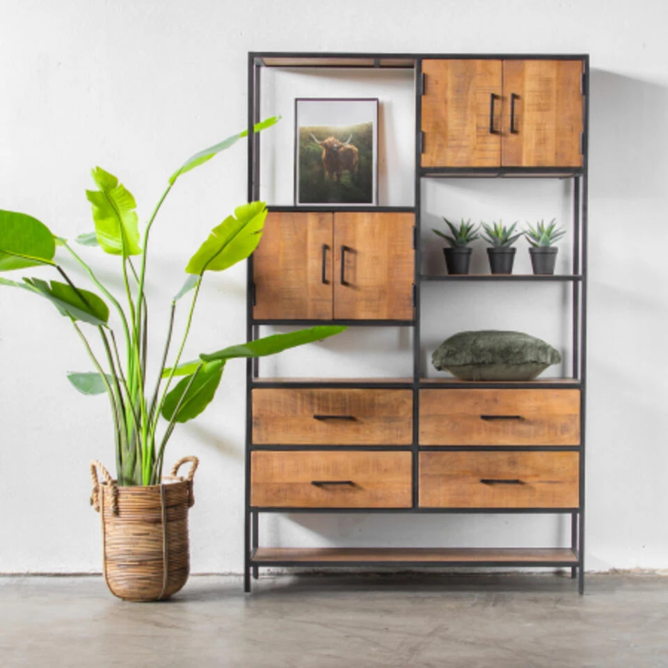 Deze kast is vervaardigd uit zwart ijzer en mango hout. De kast heeft 4 open vakken voor het tentoon stellen van je mooiste spullen. De vakkenkast heeft 2 grote vakken met deuren voor het opbergen van je spullen. En bevat 4 lades. De kast is een ware eyecatcher in je woonkamer en past in diverse interieur stijlen.