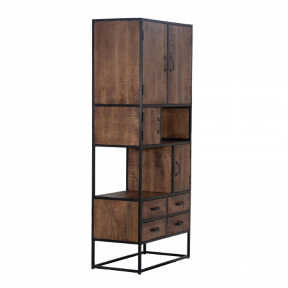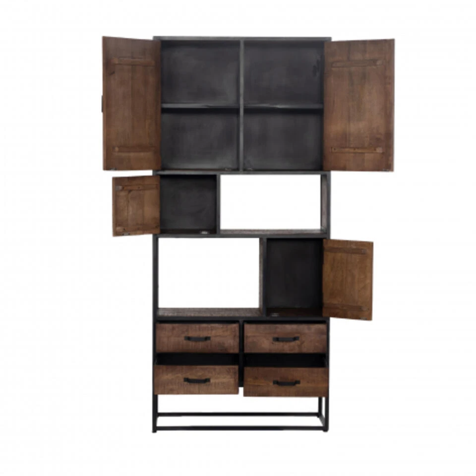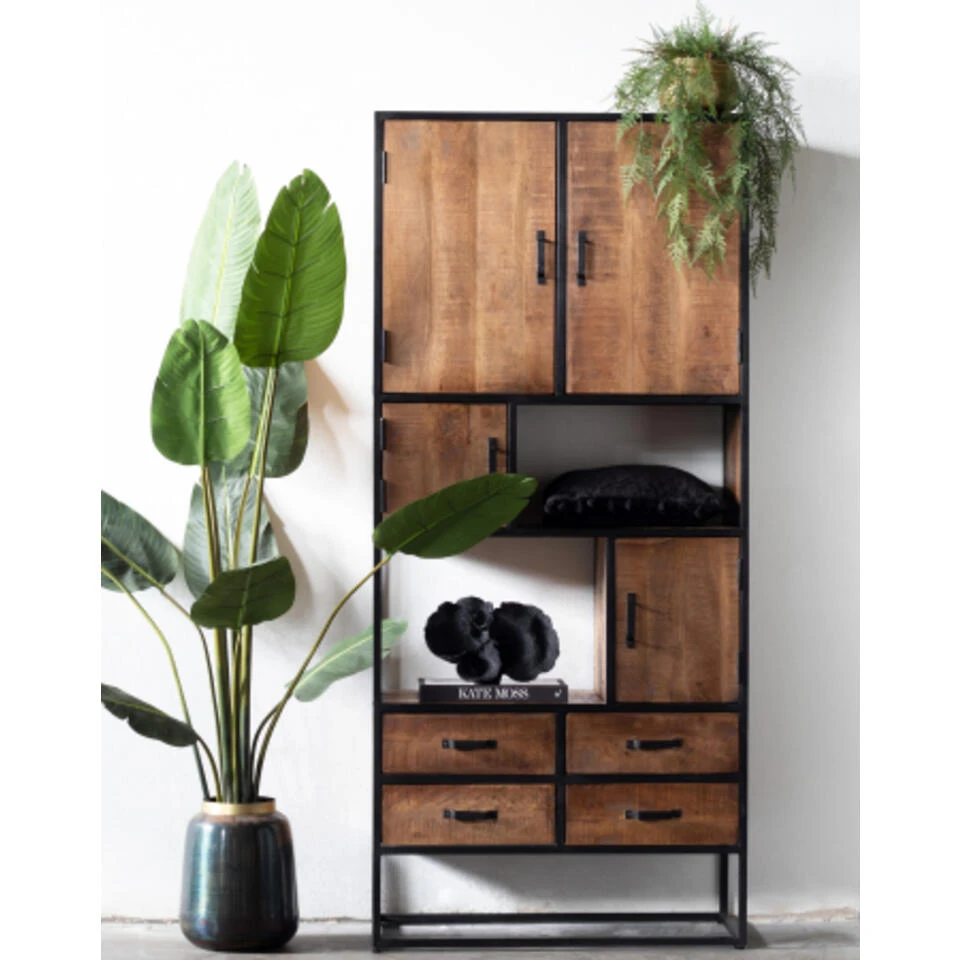 Deze vakkenkast is vervaardigd uit zwart ijzer en mangohout. De kast heeft 2 open vakken voor het tentoon stellen van je mooiste spullen. Deze vakkenkast heeft 2 grote vakken met deuren voor het opbergen van je spullen, bevat 2 open vakken en 4 lades en 2 kleine dichte vakken met deurtjes. Een echte eyecatcher en past in diverse interieur stijlen.