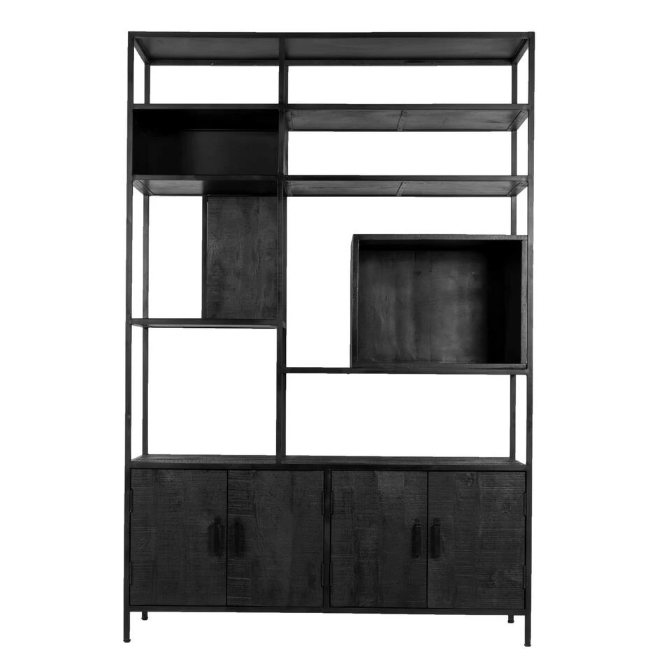 De vakkenkast Cube heeft een industriële uitstraling. De kast is vervaardigd uit zwart ijzer en hout. De kast heeft open vakken voor het tentoonstellen van je mooiste spullen. Cube heeft 2 grote vakken met deuren voor het opbergen van je spullen. Vakkenkast Cube is een ware eyecatcher in je woonkamer en past in diverse interieur stijlen. Vakkenkast Cube is 210cm hoog, 140cm breed en 42cm diep. Onze kasten bestaan uit één geheel en zijn daardoor geen bouwpakket. De kasten zijn gemaakt van sterk materiaal waardoor de kwaliteit en de levensduur gewaarborgd is. Het enige wat je hoeft te doen is de kast uitpakken en op de gewenste plek neerzetten. Je kunt gemakkelijk en snel genieten van je Giga kast! Vakkenkast Cube.