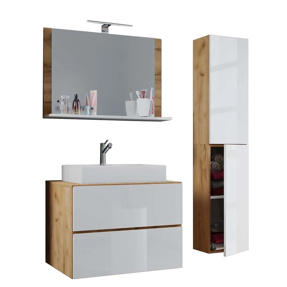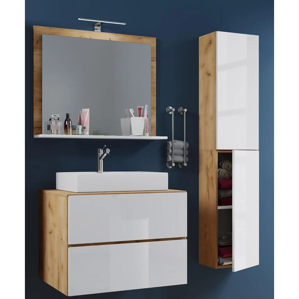 LendasL badkamer 60 cm, spiegel, honing eik decor,wit. 1 badmeubel met wastafel zonder kraan, 2 laden, spiegel zonder licht, 1 hoog meubel, 2 deuren 60 cm. Binnen: 4 vakken, 2 laden. Spiegel: