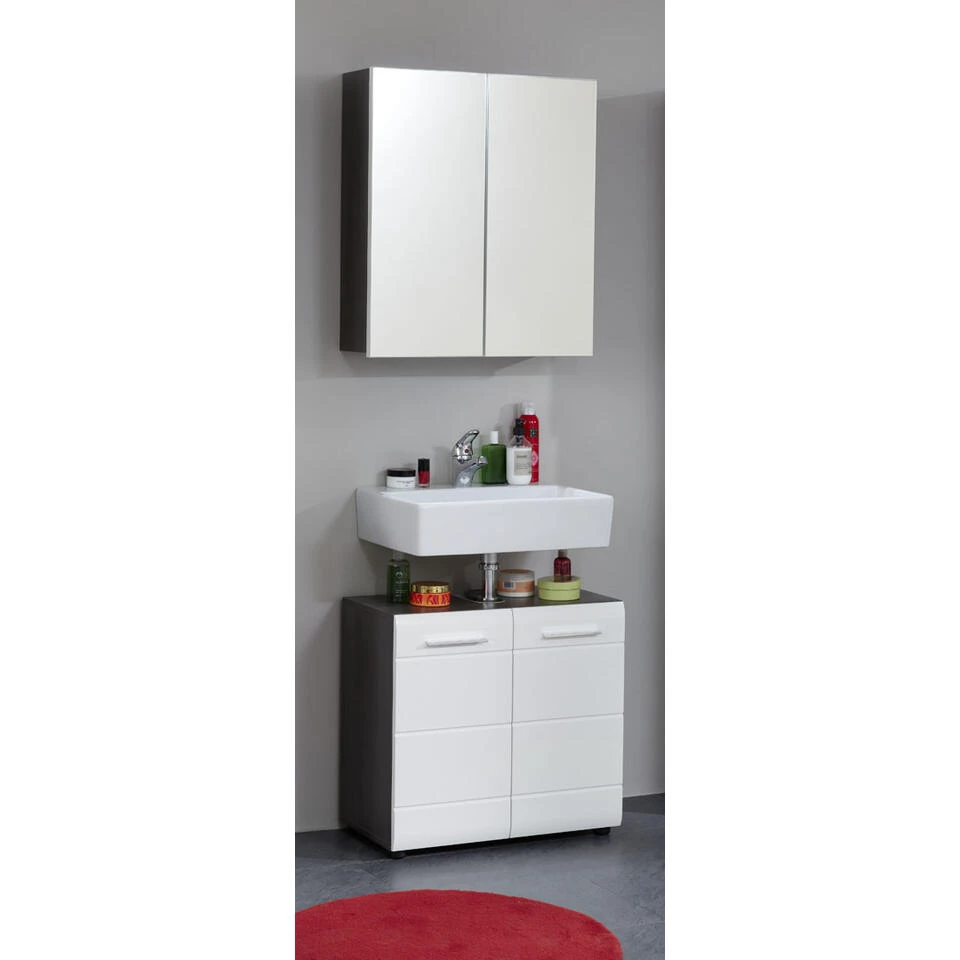 LineSkin badkamer B met spiegelkast decor rookzilver, wit hoogglans. 4 deuren. Incl. was en excl. waterkraan. Wastafelonderkast: B/H/D 60 / 57 / 31 cm, spiegelkast: B/H/D 60 / 67 / 18 cm. Je ontvangt meubels van een goede kwaliteit met een aangenaam comfort, gemaakt in een stijlvol en mooi design. Onze meubels zijn zeer aantrekkelijk geprijsd. Creëer uw eigen persoonlijke stijl met een nieuw meubel. Combineer met kleinmeubels of een paar mooie woonaccessoires. Hier verkrijg je de nieuwe woningtrends, zoals je ze in tijdschriften en magazines ziet. Bij ons vindt u unieke, praktische en comfortabele meubels met elk zijn eigen, mooi en apart design.
