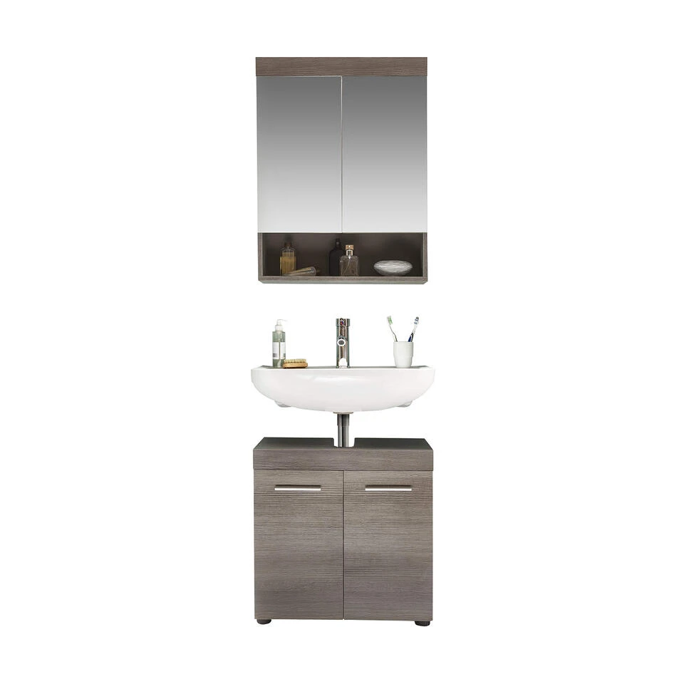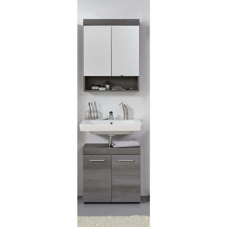 RunnerMoon badkamer B met spiegelkast rookzilver decor. 4 deuren, 1 open vak. Incl. was en excl. waterkraan. wastafelonderkast: B/H/D 58 / 57 / 31 cm, spiegelkast: B/H/D 58 / 75 / 18 cm. Je ontvangt meubels van een goede kwaliteit met een aangenaam comfort, gemaakt in een stijlvol en mooi design. Onze meubels zijn zeer aantrekkelijk geprijsd. Creëer uw eigen persoonlijke stijl met een nieuw meubel. Combineer met kleinmeubels of een paar mooie woonaccessoires. Hier verkrijg je de nieuwe woningtrends, zoals je ze in tijdschriften en magazines ziet. Bij ons vindt u unieke, praktische en comfortabele meubels met elk zijn eigen, mooi en apart design.