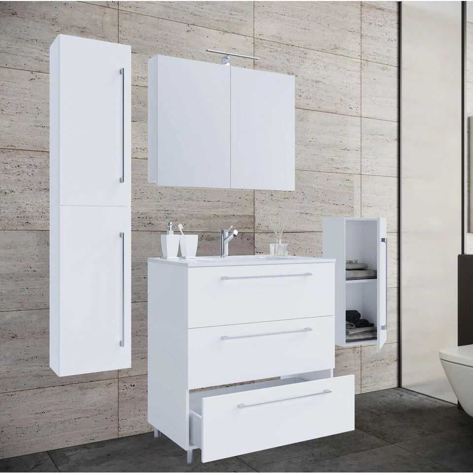 Schubo badkamer 80 cm, spiegelkast, wit. 1 lage/hoge kast + 1 spiegelkast zonder verlichting + 1 wastafel zonder kraan, 3 laden, 3 deuren 80 cm. Binnen: 8 vakken, 3 laden. Spiegel:
