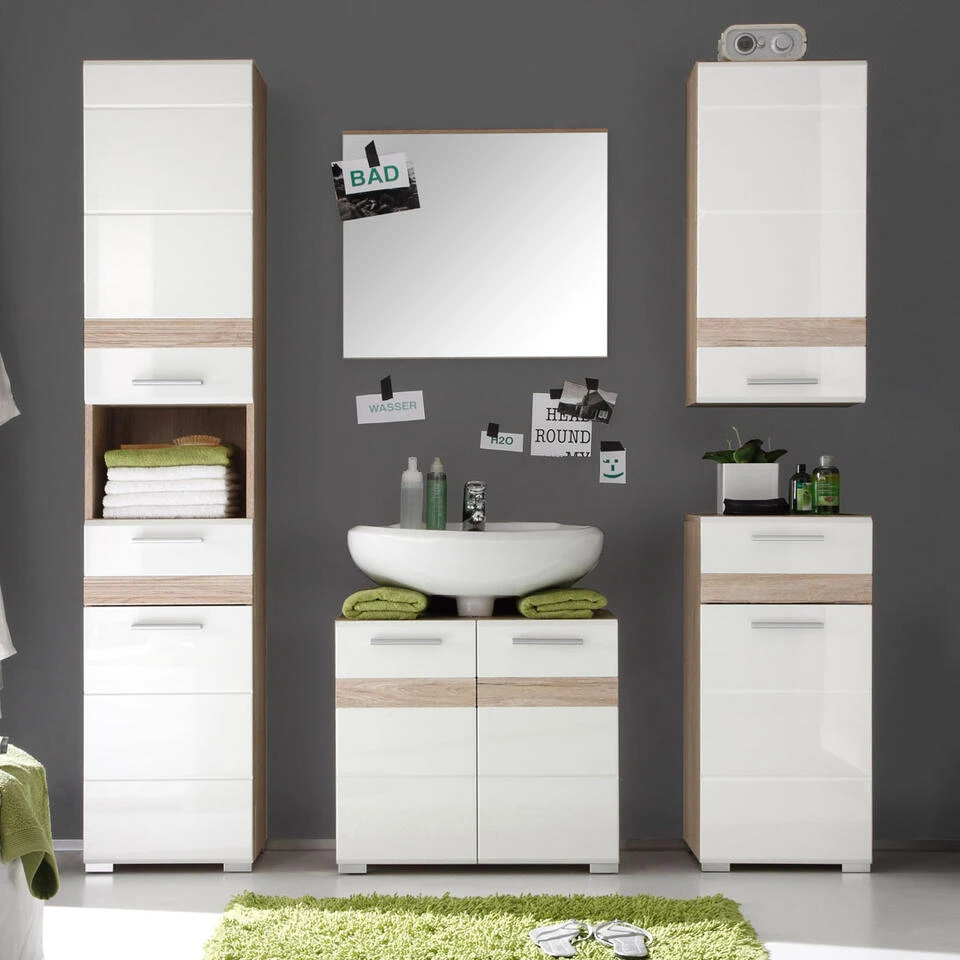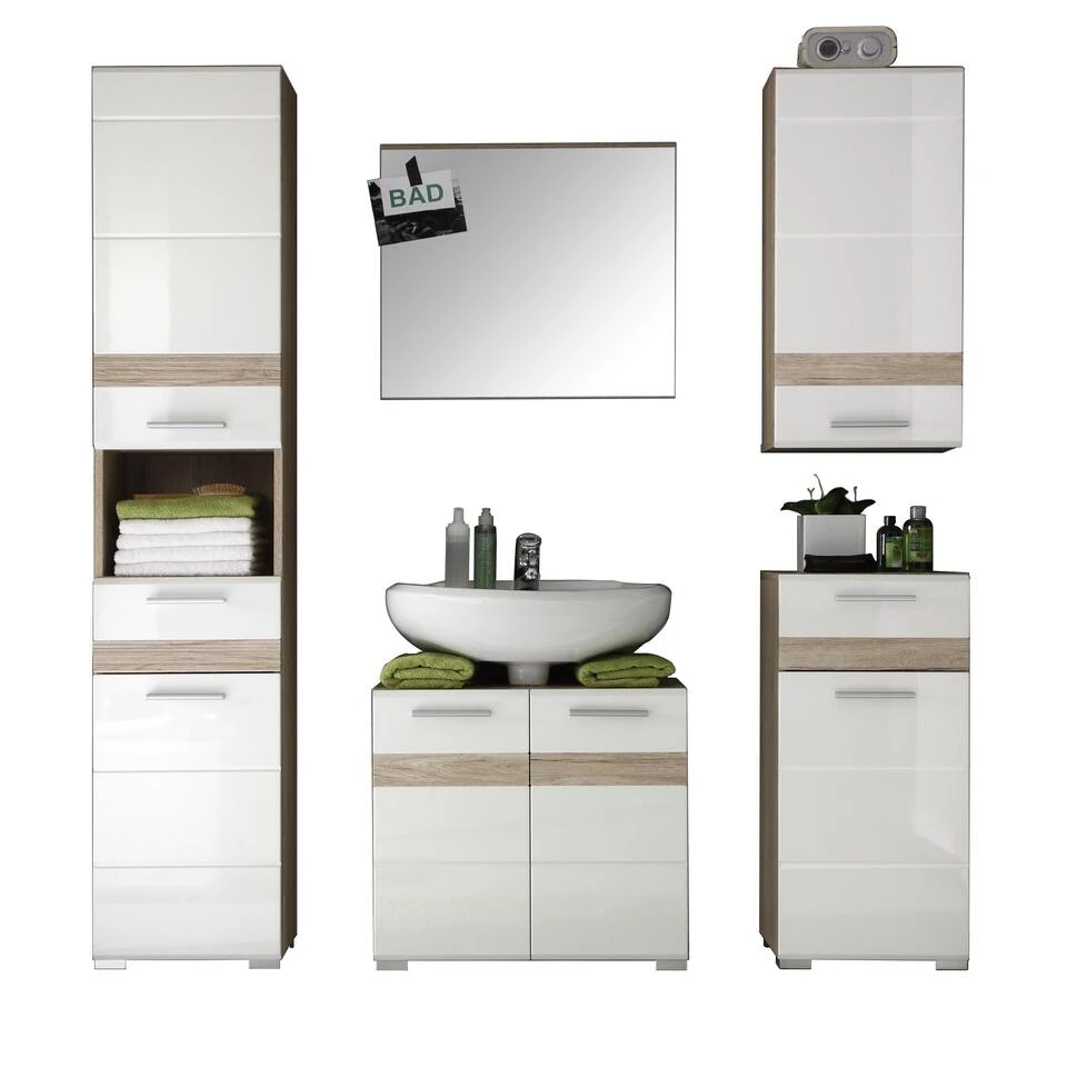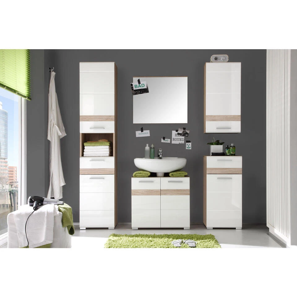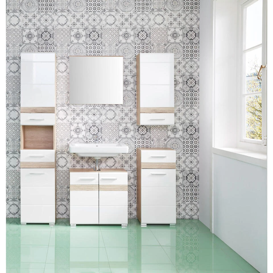 SetOne badkamer met spiegel zonder verlichting, decor licht eiken, wit hoogglans. 6 deuren, 2 lades, 1 open vak. Incl. was en excl. waterkraan. Hoge kast: B/H/D 37 / 182 / 31 cm, wastafelonderkast: B/H/D 60 / 56 / 34 cm, Spiegel: B/H/D 60 / 55 / 2 cm, Hangelement: B/H/D 37 / 77 / 24 cm, Ladenkast: B/H/D 37 / 80 / 31 cm. Je ontvangt meubels van een goede kwaliteit met een aangenaam comfort, gemaakt in een stijlvol en mooi design. Onze meubels zijn zeer aantrekkelijk geprijsd. Creëer uw eigen persoonlijke stijl met een nieuw meubel. Combineer met kleinmeubels of een paar mooie woonaccessoires. Hier verkrijg je de nieuwe woningtrends, zoals je ze in tijdschriften en magazines ziet. Bij ons vindt u unieke, praktische en comfortabele meubels met elk zijn eigen, mooi en apart design.
