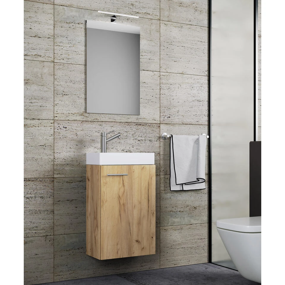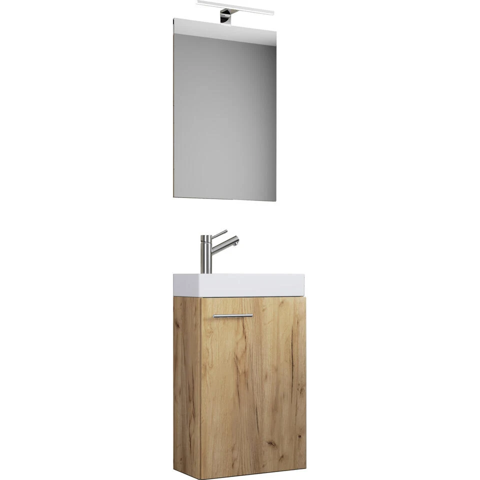 Slito badkamer A, honing eiken decor. 1 badmeubel + 1 spiegel zonder licht + 1 wasbak zonder kraan. Binnen: 1 vak. Spiegel: 59 x 40