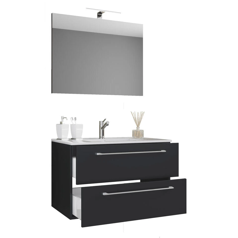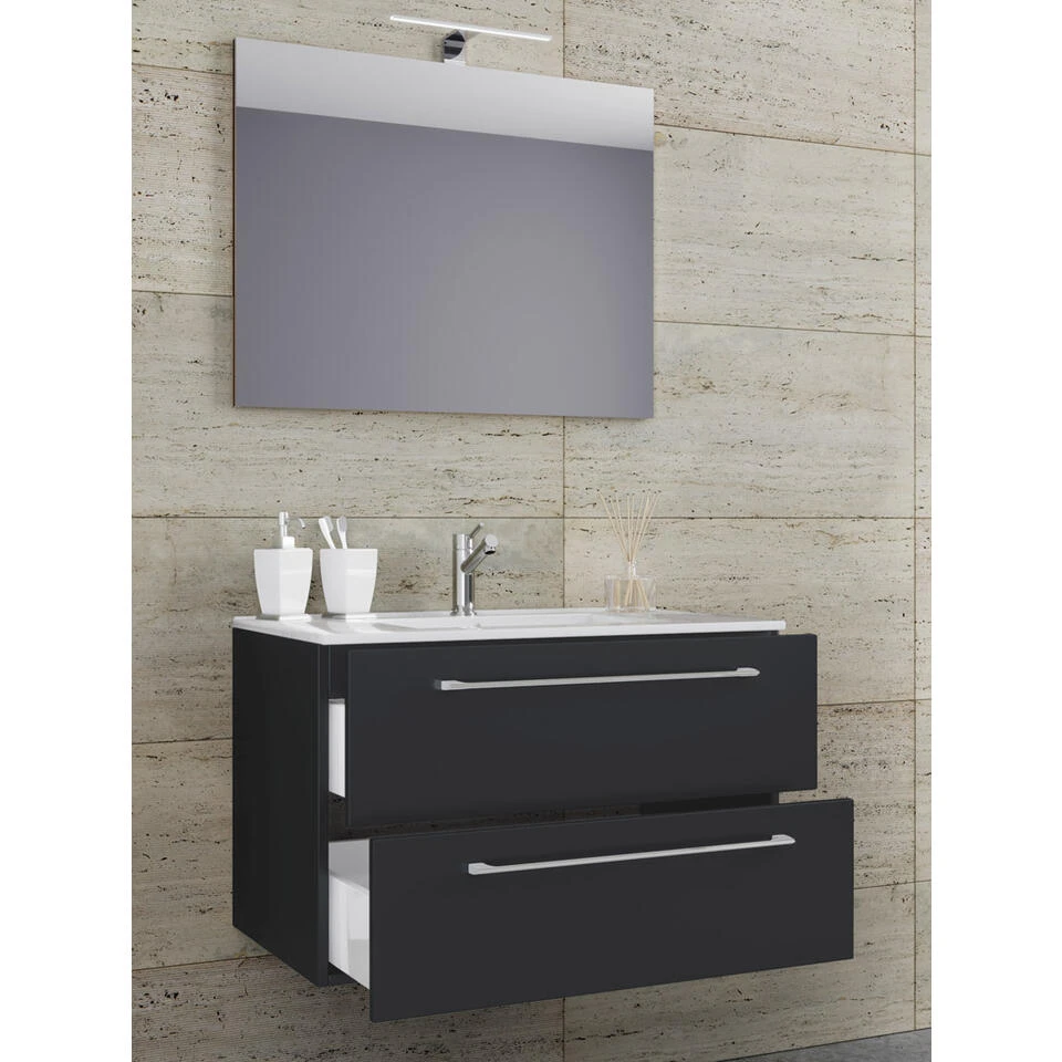 Badinos badkamer spiegel 60 cm, zwart. 1 badmeubel met wastafel zonder kraan, 2 laden, 1 spiegel 60 cm zonder licht. Binnen: 2 laden. Spiegel: