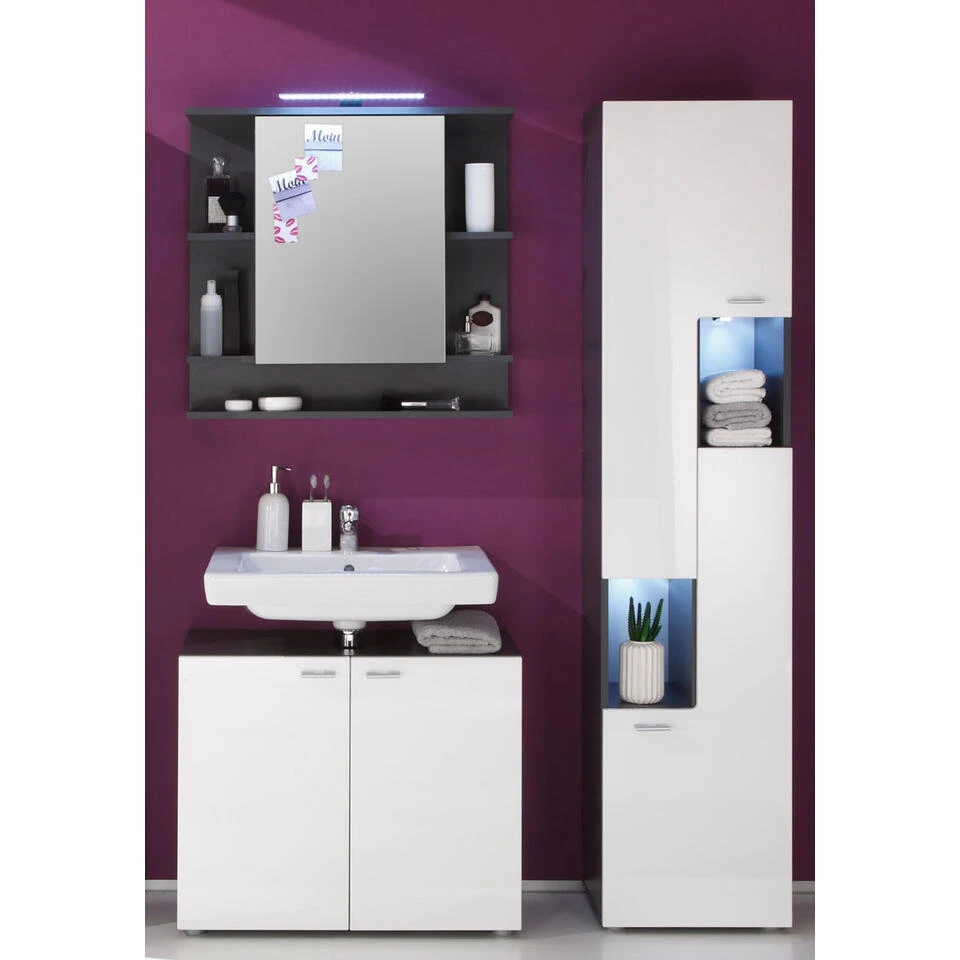 Tetis badkamer C met spiegelkast grafiet decor, wit hoogglans. 5 deuren, 5 open vakken. Incl. was en excl. waterkraan. Hoge kast: B/H/D 40 / 182 / 30 cm, wastafelonderkast: B/H/D 72 / 63 / 35 cm, spiegelkast: B/H/D 72 / 76 / 20 cm. Je ontvangt meubels van een goede kwaliteit met een aangenaam comfort, gemaakt in een stijlvol en mooi design. Onze meubels zijn zeer aantrekkelijk geprijsd. Creëer uw eigen persoonlijke stijl met een nieuw meubel. Combineer met kleinmeubels of een paar mooie woonaccessoires. Hier verkrijg je de nieuwe woningtrends, zoals je ze in tijdschriften en magazines ziet. Bij ons vindt u unieke, praktische en comfortabele meubels met elk zijn eigen, mooi en apart design.