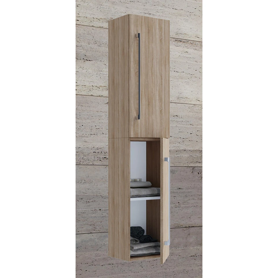 VCB6 badkamerkast hoog met 2 deuren, Sonoma eiken decor. 1 hoge kast, 2 deuren. Binnen: 4 vakken. Je ontvangt meubels van een goede kwaliteit met een aangenaam comfort, gemaakt in een stijlvol en mooi design. Onze meubels zijn zeer aantrekkelijk geprijsd. Creëer uw eigen persoonlijke stijl met een nieuw meubel. Combineer met kleinmeubels of een paar mooie woonaccessoires. Hier verkrijg je de nieuwe woningtrends, zoals je ze in tijdschriften en magazines ziet. Bij ons vindt u unieke, praktische en comfortabele meubels met elk zijn eigen, mooi en apart design.