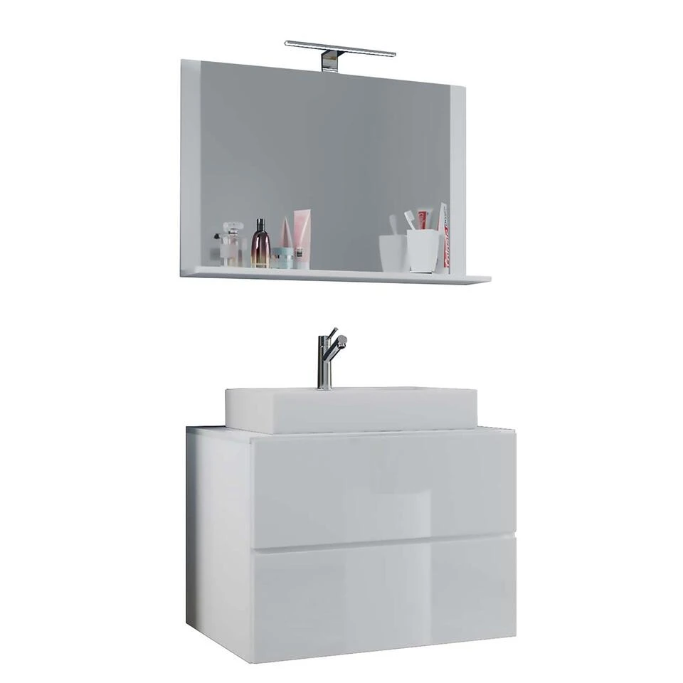LendasM badkamer 60 cm, spiegel, wit. 1 badmeubel met wastafel zonder kraan, 2 laden, spiegel 60 cm zonder licht. Binnen: 2 laden. Spiegel: