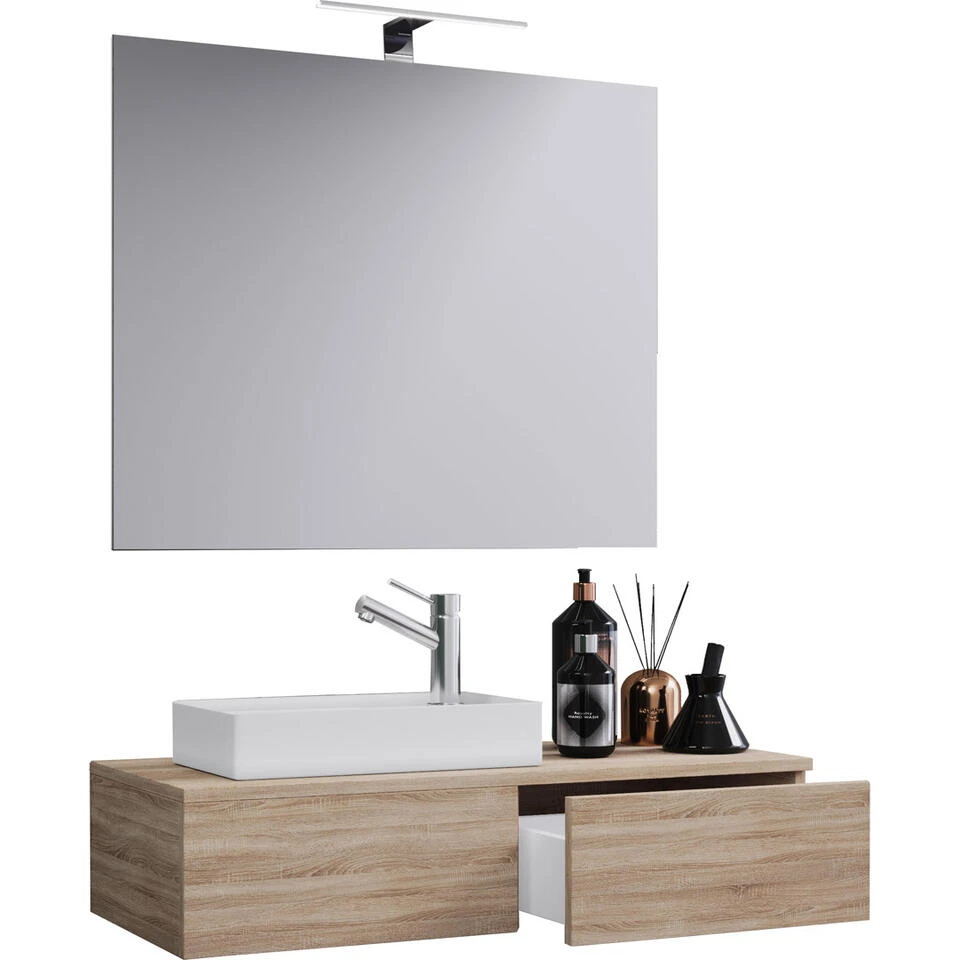 Gudas badkamer spiegel zonder verlichting, Sonoma eiken decor. 1 badmeubel met wastafel zonder kraan, 1 lade, 1 spiegel. Binnen: 1 lade. Spiegel: 59×80. Je ontvangt meubels van een goede kwaliteit met een aangenaam comfort, gemaakt in een stijlvol en mooi design. Onze meubels zijn zeer aantrekkelijk geprijsd. Creëer uw eigen persoonlijke stijl met een nieuw meubel. Combineer met kleinmeubels of een paar mooie woonaccessoires. Hier verkrijg je de nieuwe woningtrends, zoals je ze in tijdschriften en magazines ziet. Bij ons vindt u unieke, praktische en comfortabele meubels met elk zijn eigen, mooi en apart design.
