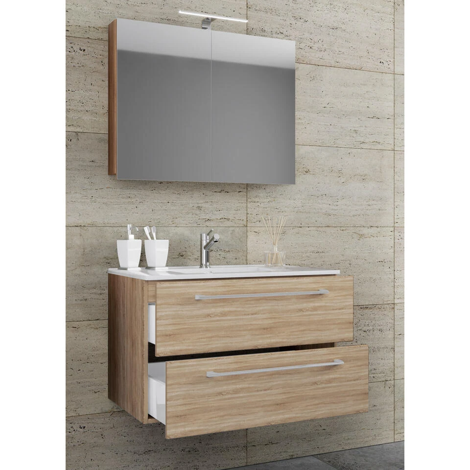 Badinos badkamer spiegelkast 60 cm, Sonoma eiken decor. 1 badmeubel met wastafel zonder kraan, 2 laden, 1 spiegelkast 60 cm zonder licht. Binnen: 2 vakken, 2 laden. Spiegel: