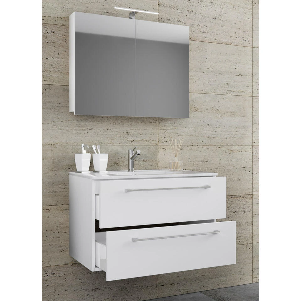 Badinos badkamer spiegelkast 60 cm, wit. 1 badmeubel met wastafel zonder kraan, 2 laden, 1 spiegelkast 60 cm zonder licht. Binnen: 2 vakken, 2 laden. Spiegel: