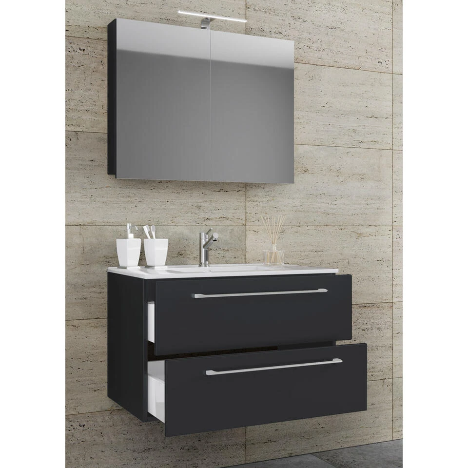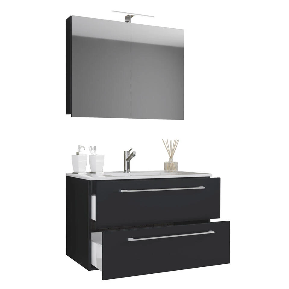 Badinos badkamer spiegelkast 80 cm, zwart. 1 badmeubel met wastafel zonder kraan, 2 laden, 1 spiegelkast 80 cm zonder licht. Binnen: 2 vakken, 2 laden. Spiegel: