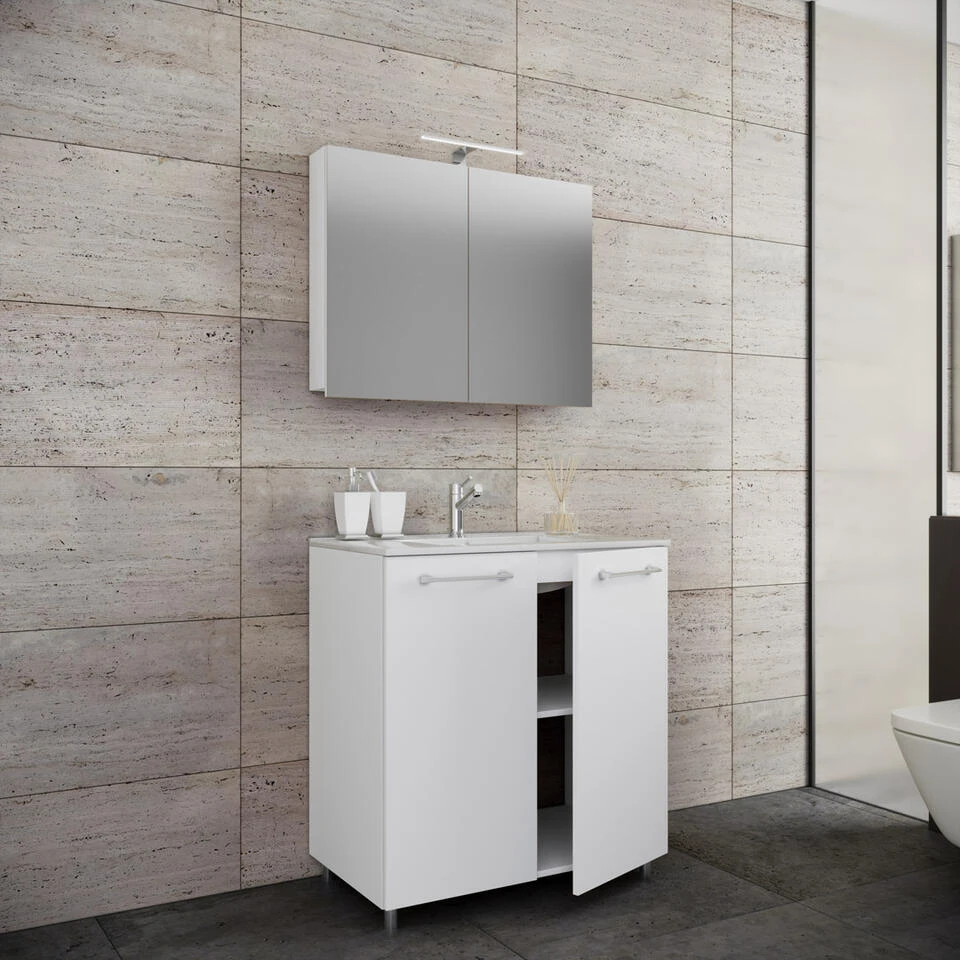 Gilos badkamer spiegelkast 80 cm zonder verlichting, wit. 1 badmeubel met wastafel zonder kraan, 2 deuren, 1 spiegelkast. Binnen: 4 vakken. Spiegel: 59x80x12. Je ontvangt meubels van een goede kwaliteit met een aangenaam comfort, gemaakt in een stijlvol en mooi design. Onze meubels zijn zeer aantrekkelijk geprijsd. Creëer uw eigen persoonlijke stijl met een nieuw meubel. Combineer met kleinmeubels of een paar mooie woonaccessoires. Hier verkrijg je de nieuwe woningtrends, zoals je ze in tijdschriften en magazines ziet. Bij ons vindt u unieke, praktische en comfortabele meubels met elk zijn eigen, mooi en apart design.