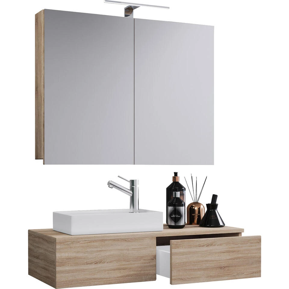 Gudas badkamer spiegelkast zonder verlichting, Sonoma eiken decor. 1 badmeubel met wastafel zonder kraan, 1 lade, 1 spiegelkast. Binnen: 2 vakken, 1 lade. Spiegel: 59x80x12. Je ontvangt meubels van een goede kwaliteit met een aangenaam comfort, gemaakt in een stijlvol en mooi design. Onze meubels zijn zeer aantrekkelijk geprijsd. Creëer uw eigen persoonlijke stijl met een nieuw meubel. Combineer met kleinmeubels of een paar mooie woonaccessoires. Hier verkrijg je de nieuwe woningtrends, zoals je ze in tijdschriften en magazines ziet. Bij ons vindt u unieke, praktische en comfortabele meubels met elk zijn eigen, mooi en apart design.