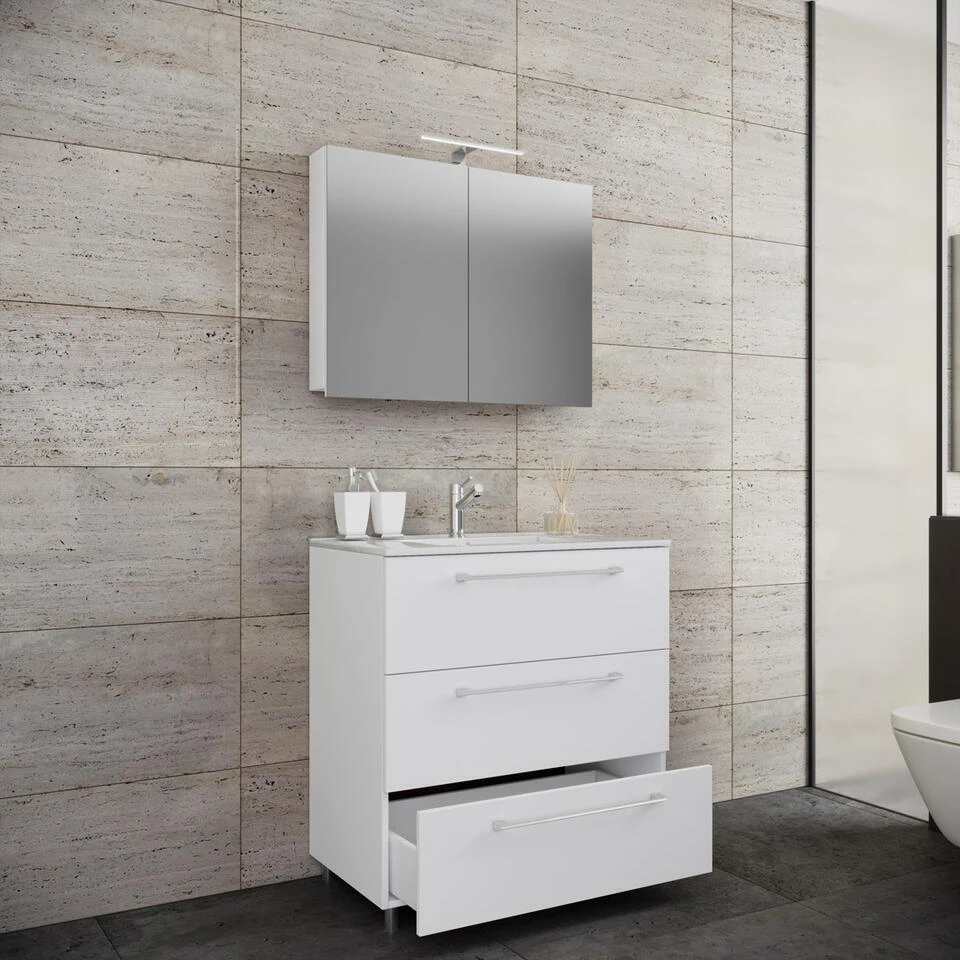 Schubo badkamer spiegelkast 60 cm uden verlichting, wit. 1 badmeubel met wastafel zonder kraan, 3 laden, 1 spiegelkast. Binnen: 2 vakken, 3 laden. Spiegel: 59×80. Je ontvangt meubels van een goede kwaliteit met een aangenaam comfort, gemaakt in een stijlvol en mooi design. Onze meubels zijn zeer aantrekkelijk geprijsd. Creëer uw eigen persoonlijke stijl met een nieuw meubel. Combineer met kleinmeubels of een paar mooie woonaccessoires. Hier verkrijg je de nieuwe woningtrends, zoals je ze in tijdschriften en magazines ziet. Bij ons vindt u unieke, praktische en comfortabele meubels met elk zijn eigen, mooi en apart design.
