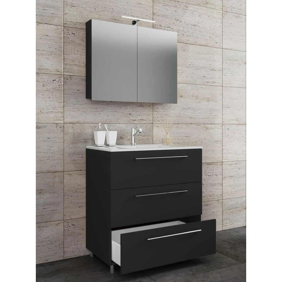 Schubo badkamer spiegelkast 80 cm zonder verlichting, zwart. 1 badmeubel met wastafel zonder kraan, 3 laden, 1 spiegelkast. Binnen: 2 vakken, 3 laden. Spiegel: 59x80x12. Je ontvangt meubels van een goede kwaliteit met een aangenaam comfort, gemaakt in een stijlvol en mooi design. Onze meubels zijn zeer aantrekkelijk geprijsd. Creëer uw eigen persoonlijke stijl met een nieuw meubel. Combineer met kleinmeubels of een paar mooie woonaccessoires. Hier verkrijg je de nieuwe woningtrends, zoals je ze in tijdschriften en magazines ziet. Bij ons vindt u unieke, praktische en comfortabele meubels met elk zijn eigen, mooi en apart design.