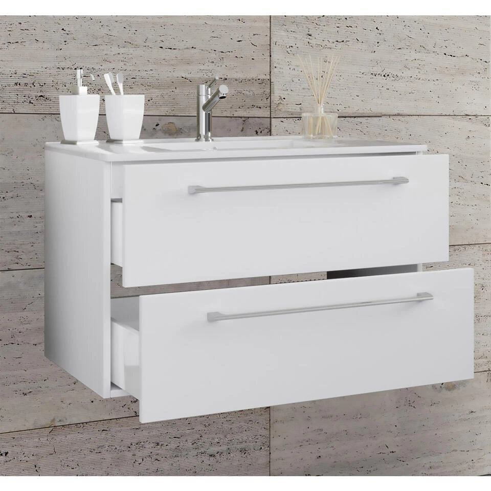 Badinos wastafel 60 cm, 2 laden, wit. 1 badmeubel met wastafel zonder kraan, 2 laden 60 cm. Binnen: 2 laden. Je ontvangt meubels van een goede kwaliteit met een aangenaam comfort, gemaakt in een stijlvol en mooi design. Onze meubels zijn zeer aantrekkelijk geprijsd. Creëer uw eigen persoonlijke stijl met een nieuw meubel. Combineer met kleinmeubels of een paar mooie woonaccessoires. Hier verkrijg je de nieuwe woningtrends, zoals je ze in tijdschriften en magazines ziet. Bij ons vindt u unieke, praktische en comfortabele meubels met elk zijn eigen, mooi en apart design.