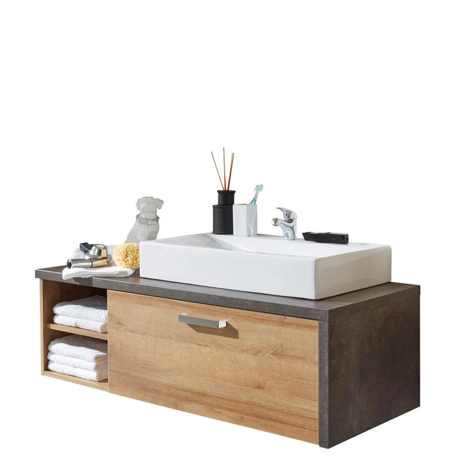BayBad wastafel 1 lade, 2 open vakken, wastafel zonder kraan honing eiken decor, beton decor. 1 legplank. Je ontvangt meubels van een goede kwaliteit met een aangenaam comfort, gemaakt in een stijlvol en mooi design. Onze meubels zijn zeer aantrekkelijk geprijsd. Creëer uw eigen persoonlijke stijl met een nieuw meubel. Combineer met kleinmeubels of een paar mooie woonaccessoires. Hier verkrijg je de nieuwe woningtrends, zoals je ze in tijdschriften en magazines ziet. Bij ons vindt u unieke, praktische en comfortabele meubels met elk zijn eigen, mooi en apart design.