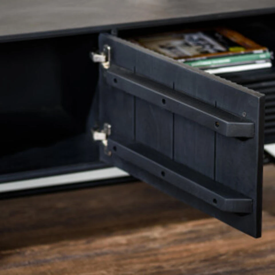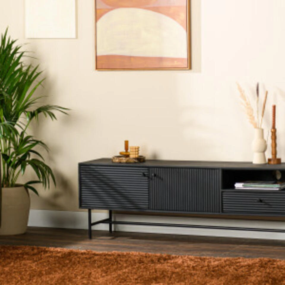 Dit trendy TV-meubel is gemaakt van hoogwaardig acaciahout en heeft een zwart metalen onderstel. Het meubels is naast dat het heel praktisch is ook nog is een echte eye-cachter bij jou in de woonkamer. De afwerking van de deurtjes met verschillende latjes zorgt voor een speels effect. Het TV-meubel heeft zowel open vak als gelosten deurtjes. Ideal dus om spullen in op te bergen. Dit meubel maakt deel uit van een serie en is ook te krijgen in een dressoir en wandkast.Â