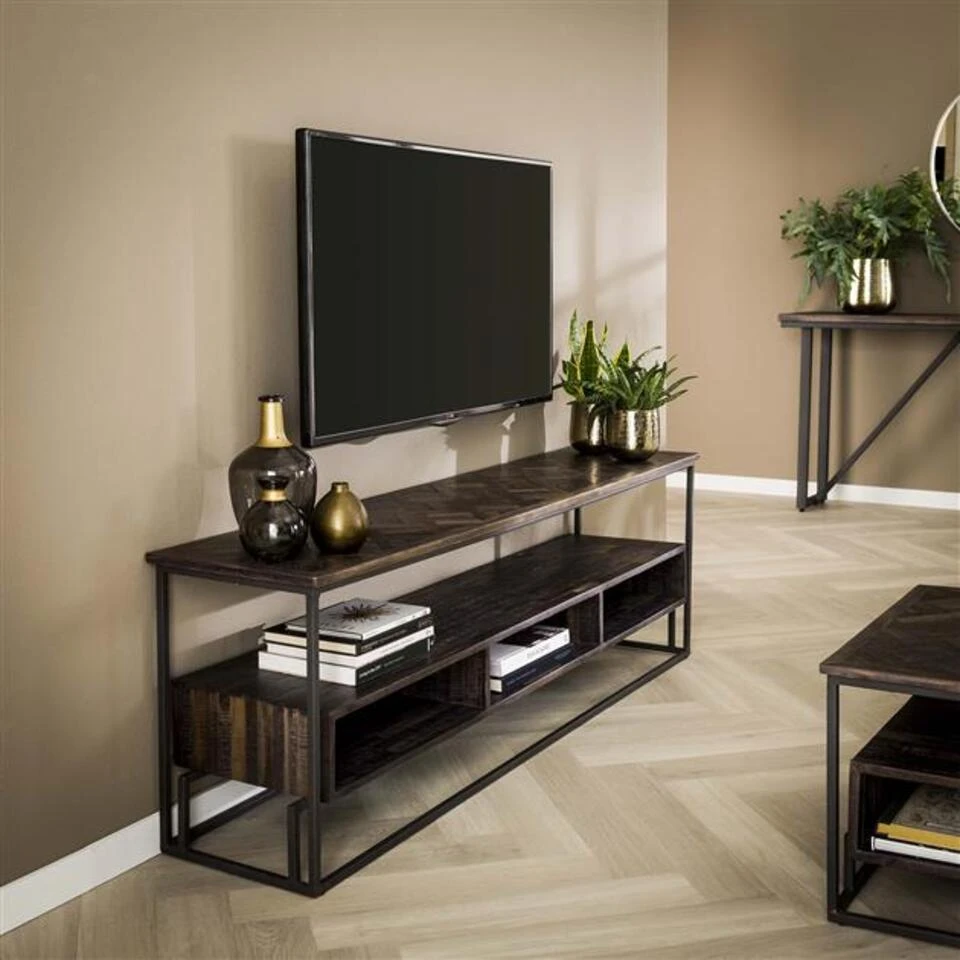 Dit trendy TV-meubel ‘Vine’ is uitgevoerd in teakhout. Het bovenste blad is ingelegd met een ‘versailles’ houtpatroon wat lijkt op visgraat en dit zorgt voor een prachtige uitstraling. Het TV-meubel heeft een groot open vak en drie kleinere open vakken om spullen in op te bergen.Β Dit TV-meubel maakt deel uit van de ‘Vine’ serie.