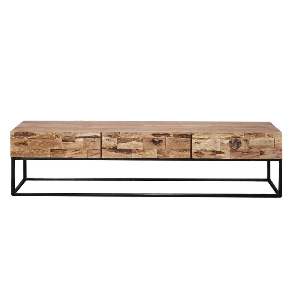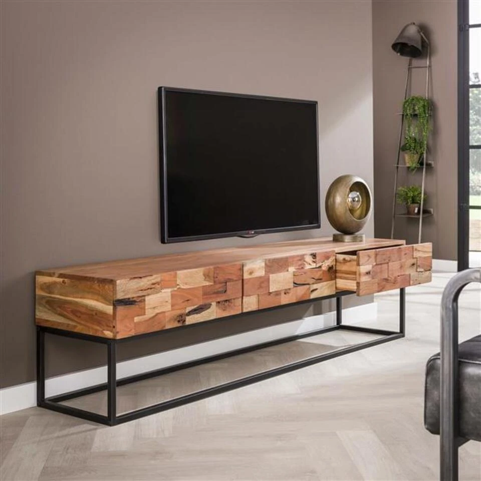 Dit tv-meubel ‘Mill’ is uitgevoerd in zandgestraald acacia hout in combinatie met een metalen frame. Dit model is voorzien van drie lades. Het tv-meubel is ingelegd met verschillende stroken hout en dit geeft het meubel een stoer en eigentijds karakter. Dit tv-meubel maakt deel uit van de ‘Mill’ serie.