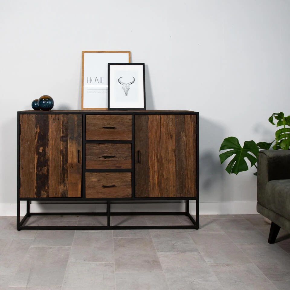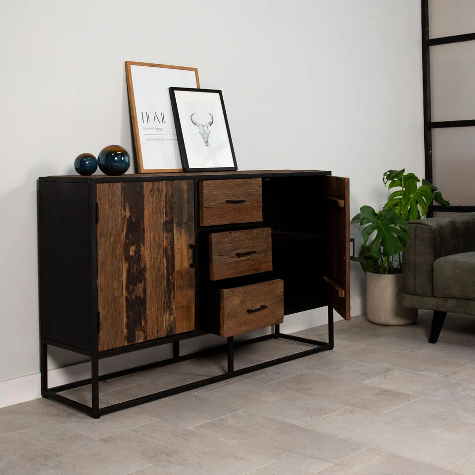 Dit industriële dressoir Rayan is uitgewerkt in sleeper wood. Dit type hout geeft het dressoir een robuuste uitstraling. De combinatie met het zwarte frame geeft het dressoir een echte industriële look. Ook biedt het dressoir Rayan voldoende opbergruimte dankzij de 3 lades en de 2 deuren. Dit alles maakt het industriële dressoir Rayan tot de perfecte toevoeging voor je industriële interieur!