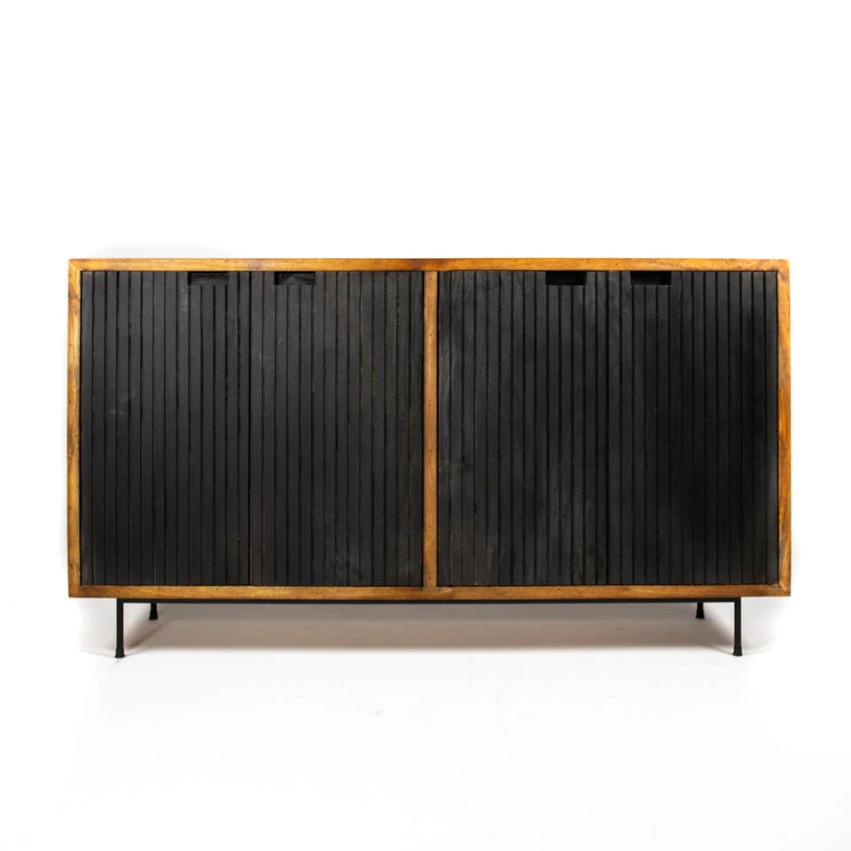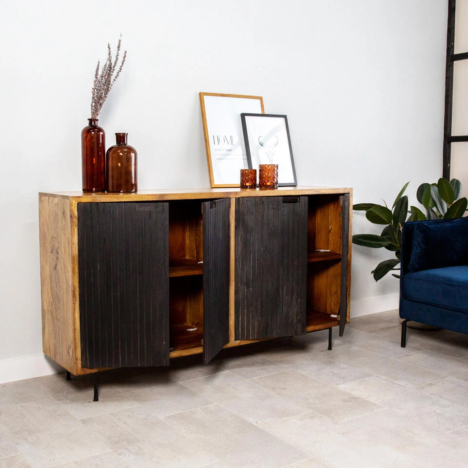 Het frame van de industriële wandkast Felix is gemaakt van zwart metaal. De combinatie met het mangohout geeft deze wandkast een stoere, industriële uitstraling.