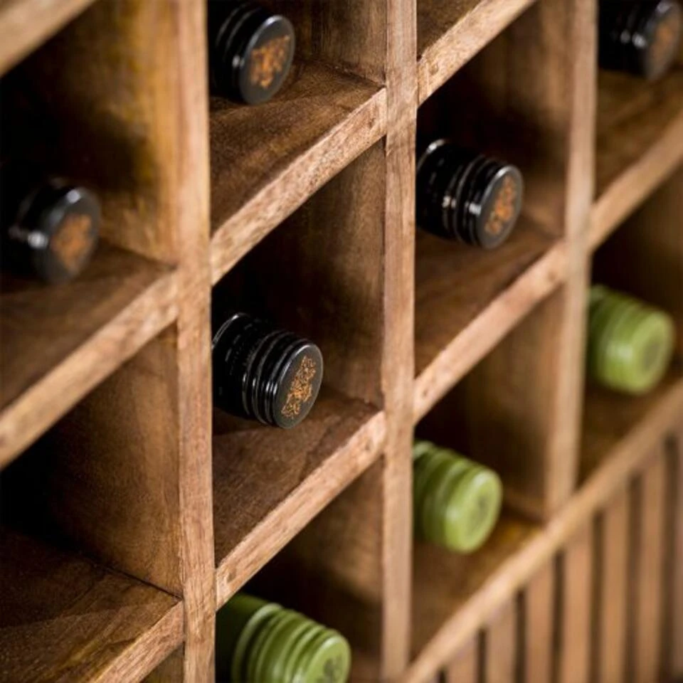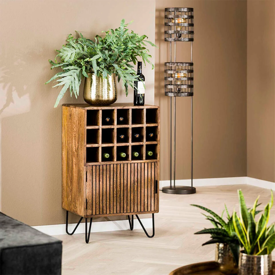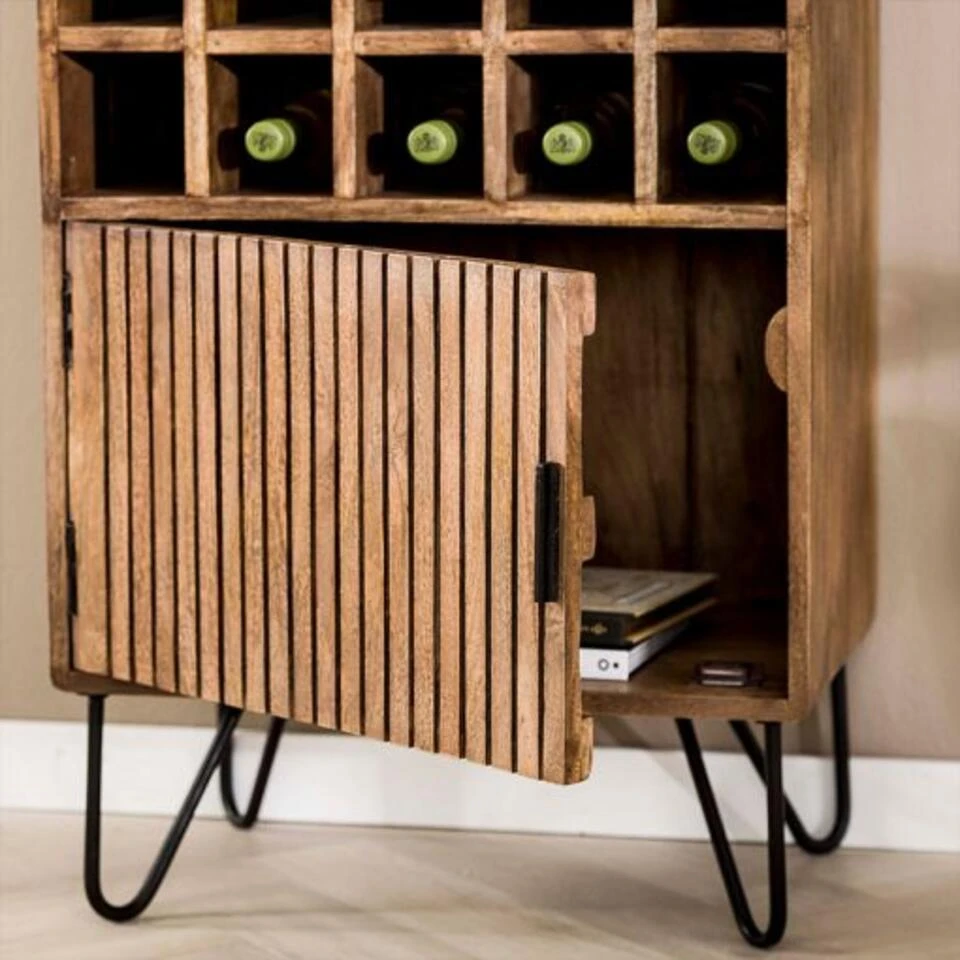 Deze wijnkast Namra heeft een stoere look dankzij het unieke hout. Ze is geschikt voor industriële woningen. De poten geven een elegant voorkomen aan de kast, het is een knipoog naar vintage en daardoor is deze kast ook heel geliefd voor retro interieurs.
