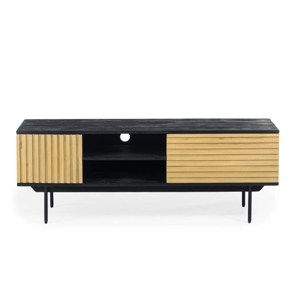 Hoe stoer is dit Kaplan tv-meubel van het woonmerk Vurna? Vurna staat bekend om haar diverse meubelen met een mooie prijs-kwaliteitsverhouding. Daar is Kaplan zeker een goed voorbeeld van. Dit tv-meubel past helemaal binnen de trend van nu. Ze is gemaakt van mangohout en heeft een breedte van 140 cm. Het onderstel is gemaakt van zwart staal. Het tv-meubel kent twee open vakken, een deurtje en een vak met klapluikje. Genoeg ruimte om de spullen in op te bergen. De poten zijn hoog, waardoor dit stoere meubel een open uitstraling heeft. De kast is verkrijgbaar in zwart of zwart/naturel. Voor ieder wat wils! De horizontale en verticale lijnen in het hout zorgen voor de bijzondere uitstraling van Kaplan.