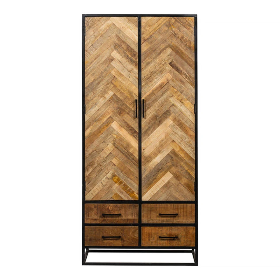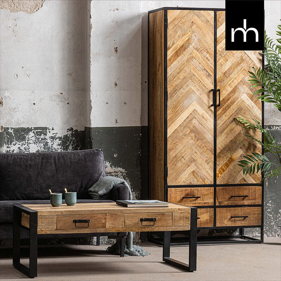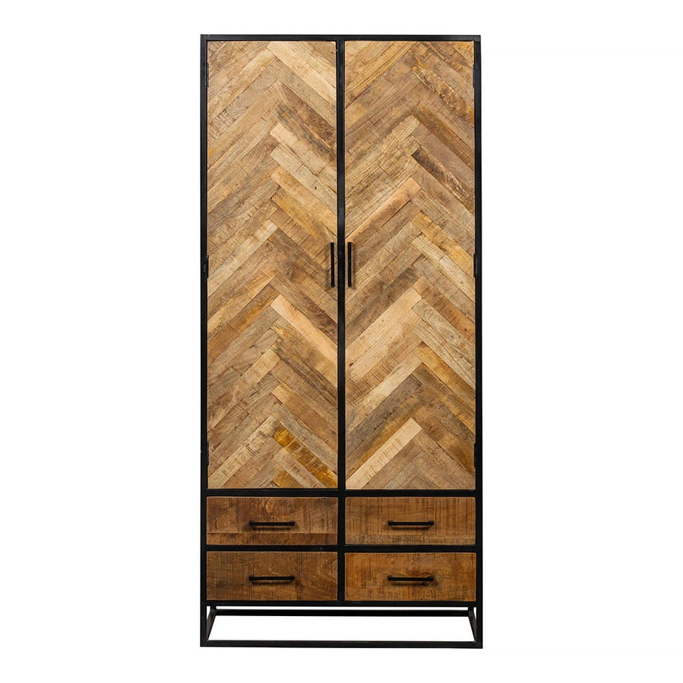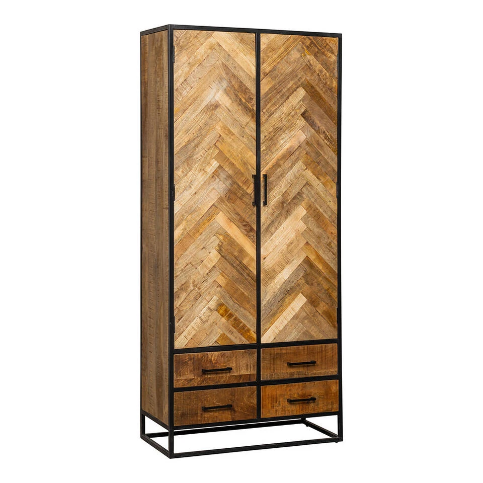 De dichte wandkast New Haven blinkt uit in schoonheid! Aan de robuuste combinatie van het warme mangohout met de metalen accenten is een stijlvol visgraatpatroon toegevoegd. Het meubel kan in alle kamers van het huis van pas komen en kan uitstekend als boekenkast, bijkeukenkast of zelfs als kledingkast worden gebruikt. Achter de deuren liggen drie brede planken en aan de onderkant zitten nog vier lades gevestigd om allerlei eigendommen op te kunnen bergen.