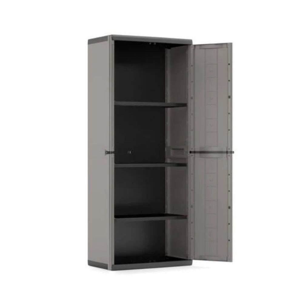 De kunststof kast Jolly van Keter is een ideale opberkast voor in de bijkeuken of garage. De kast heeft 3 planken die je zelf in hoogte kunt verstellen zodat je zelf kunt bepalen hoe hoog de vakken zijn. De planken kunnen elk een maximaal gewicht van 10 kg dragen. Door de neutrale grijze kleur van deze plastic kast past hij in ieder interieur.