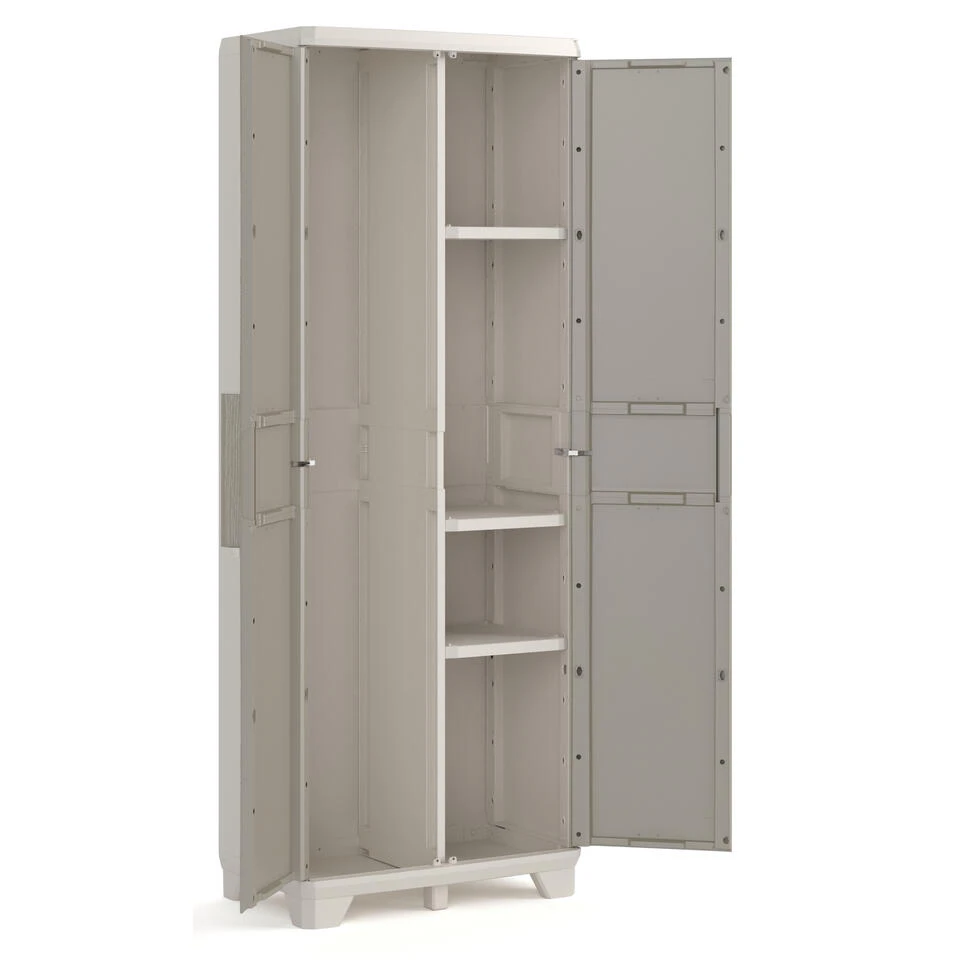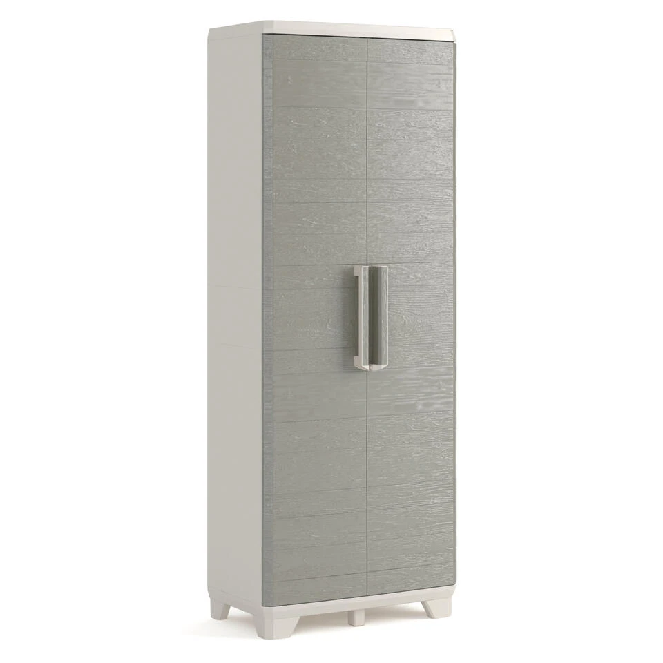 De Keter Wood Grain Multipurpose opbergkast met deuren heeft een strakke natuurlijke uitstraling van hout, in een modern lichtgrijs design. De tuinkast is ook UV-bestendig zodat je hem onder een overkapping kunt plaatsen en de kast toch niet vervaagd door de zon. Deze tuinkast is perfect voor het opbergen van items van verschillende grootte. De 3 in hoogte verstelbare plankjes bieden jou de flexibiliteit die je nodig hebt. De 3 plankjes kunnen elk 10 kg dragen, en de grote vaste plank bovenin kan nog eens 15 kg dragen.