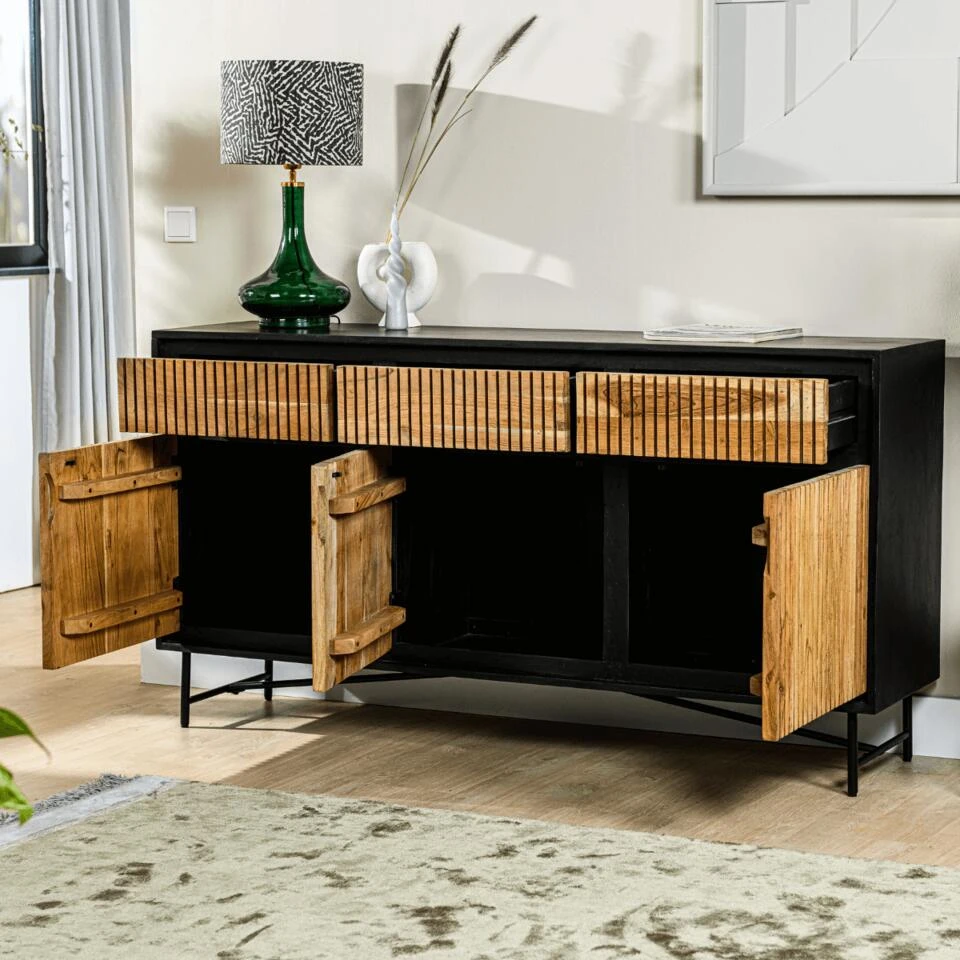 Het Lake dressoir van Vurna is een prachtig meubelstuk met een natuurlijke uitstraling en een modern tintje. Met een breedte van 160 cm biedt dit dressoir veel opbergruimte voor allerlei spullen in je woonkamer, eetkamer of hal. Het dressoir heeft drie grote opbergplekken, waardoor je jouw spullen op een overzichtelijke manier kunt opbergen. Of het nu gaat om boeken, servies of decoratieve voorwerpen, je kunt ze gemakkelijk kwijt in deze grote opbergvakken. Het dressoir heeft ook drie lades, waarin je kleinere spullen netjes kunt opbergen en snel kunt terugvinden. Wat dit dressoir zo bijzonder maakt, zijn de ribbelpatronen op de deuren van de kast. Deze patronen geven de kast een speelse uitstraling en voegen een decoratief element toe aan het meubelstuk. De deuren zijn gemaakt van hoogwaardig acaciahout met een prachtige natuurlijke uitstraling die mooi contrasteert met het zwarte acaciahout van het frame. Het Lake dressoir is niet alleen een functioneel meubelstuk, maar ook een stijlvolle toevoeging aan je interieur. Door de platte bovenkant van het dressoir kun je het ook gebruiken als displayruimte voor decoratieve voorwerpen, zoals een mooie vaas of een fotolijst. Het dressoir is eenvoudig te reinigen en te onderhouden, waardoor het een duurzame en praktische keuze is voor elk huis.