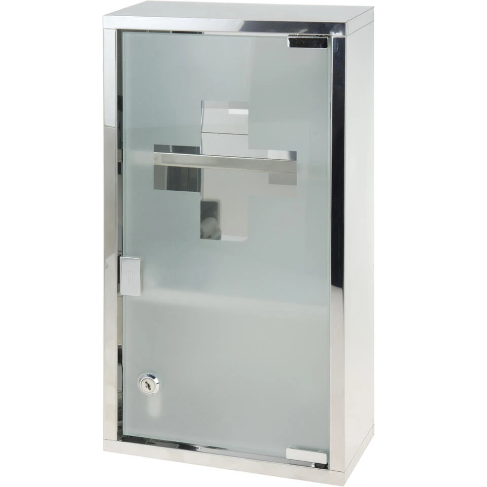 Medicijnkastje met matglazen deur met transparant kruis. Het deurtje sluit d.m.v. een magnetische druksluiting en is voorzien van een slot met 2 sleutels. In het kastje bevinden zich 2 plankjes.