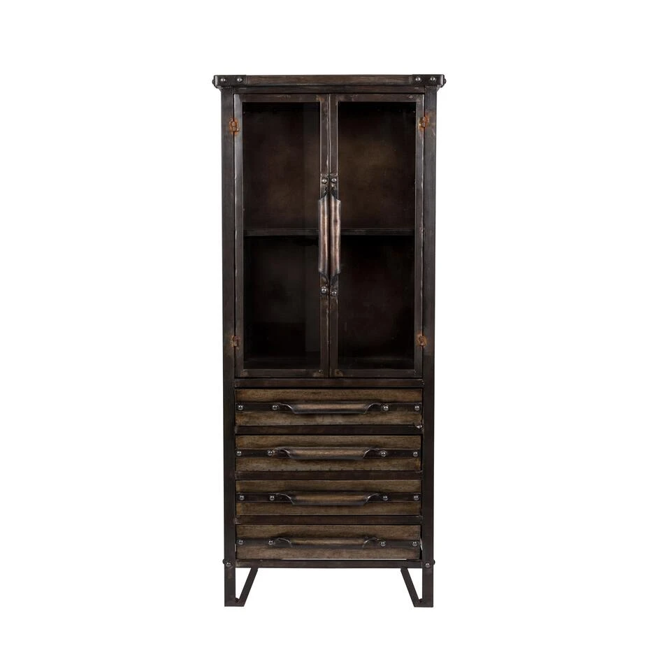 Hij is precies als een oude apothekerskast met glazen deurtjes! Ideale voor wie een stoere, vintage look in huis wil halen. In het onderste deel van deze vitrinekast heeft vier lades met stoere handgrepen. In deze kast met glazen deuren kun je, je mooiste schatten kwijt.