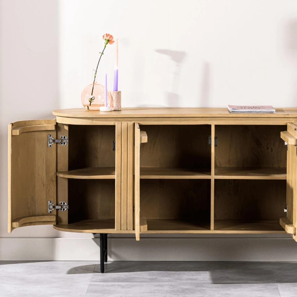 Het Polan dressoir is helemaal van deze tijd. Dat komt door het gebruik van prachtige materialen en de halfronde afwerking. Polan heeft een klassieke maar moderne uitstraling en past perfect binnen diverse woonstijlen. Polan is gemaakt van acaciahout en verkrijgbaar in het zwart of naturel. Voor ieder wat wils! Door de ronde afwerking heeft ze een open en fijne uitstraling. Het dressoir heeft hoge poten van zwart staal. Het mooie van deze kast is dat enkel de poten gemonteerd moeten worden. Dat is zo gebeurd, waardoor je direct van dit prachtige dressoir kan genieten! De kast is voorzien van vier deurtjes met een horizontale legplank waardoor je acht kastjes krijgt. Voldoende ruimte om jouw spulletjes achter op te bergen. Multifunctioneel en modern! Polan heeft het allemaal.