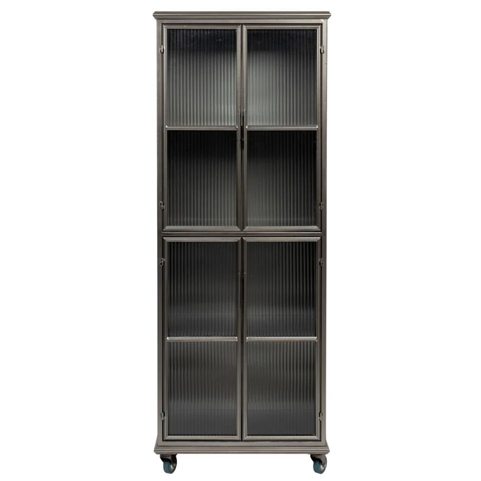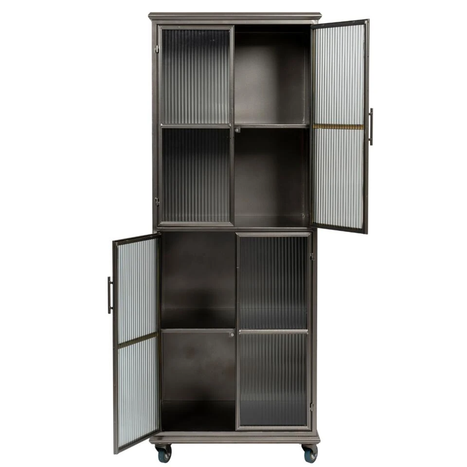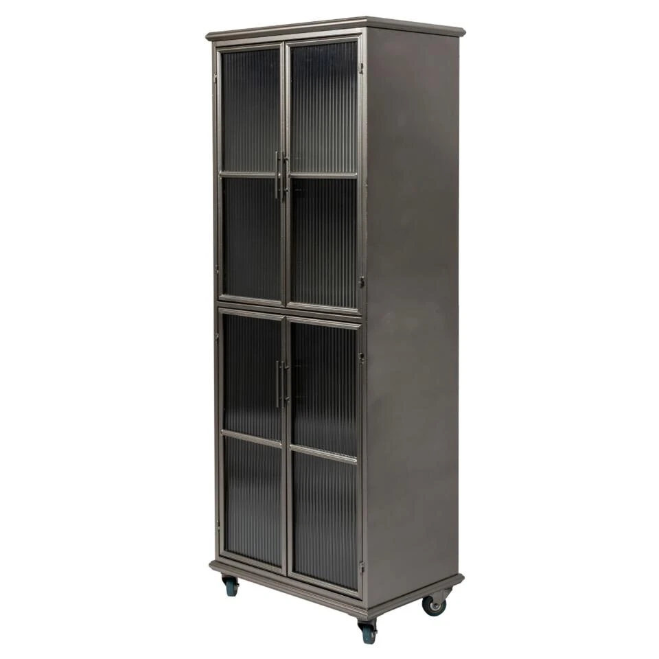 De Billund wandkast, van het woonmerk Puur, is volledig van metaal en afgelakt in ‘gun metal’ grijs. Dit geeft deze wandkast zijn stoere uitstraling. De wandkast heeft een afmeting van 60x38x160 cm. Mooi aan deze kast zijn de openslaande deuren aan zowel onder- als bovenzijde, voorzien van stalen handgreep. Dankzij de wielen met rem is de kast makkelijk van zijn plaats te rijden. Ideaal voor bijvoorbeeld het stofzuigen. De geribbelde glazen ruitjes maken deze robuuste kast helemaal af. Deze Billund serie bestaat verder uit een dressoir. Combineer deze meubels voor eenheid binnen jouw interieur. Billund voelt zich het meest thuis in een industrieel en stoer interieur.