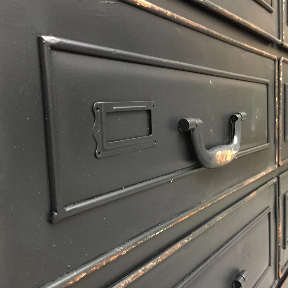 Wat rest is deze ultra toffe kast met 12 laden, voorzien van labelvensters, scharnierende grepen en wat eenvoudige details, zoals de sierlijsten. De matzwarte kleur die her en der wat opgeruwd is, zodat de onderliggende bruine laag naar boven komt, maakt ‘m af. Het geeft hem het karakter waar we in Denemarken verliefd op werden. Wat ga jij er mee doen?