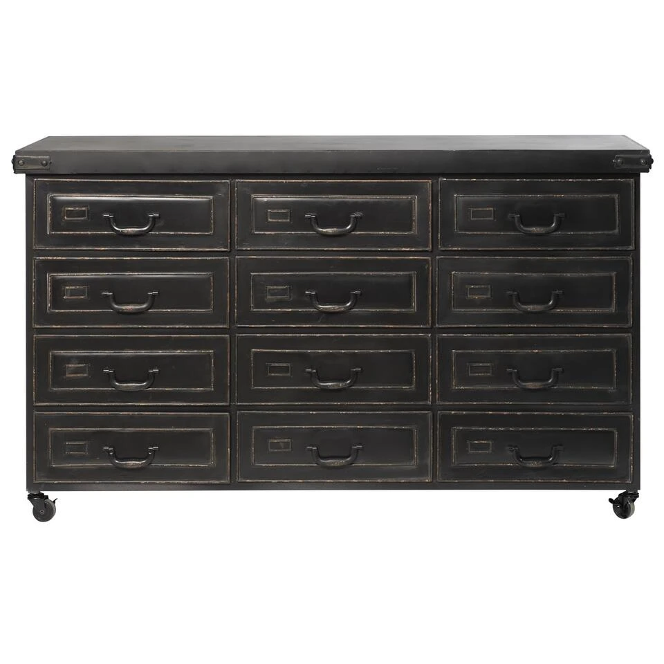 Functie boven vorm. Zo was Ãe bedoeld. En eigenlijk was juist dát wat ‘m zo tof maakte, dus zijn eenvoud zetten we door. In het materiaal; compleet metaal, in zijn kleur; volledig zwart en in zijn vorm; geen poespas. Wél maakten we het dressoir wat handzamer door hem flink te verkleinen en schroefden we er een set wielen onder, gewoon, omdat ze zo tof zijn en hem iets minder massief maken. Wil je de wielen niet, ze zijn er zo af te schroeven!